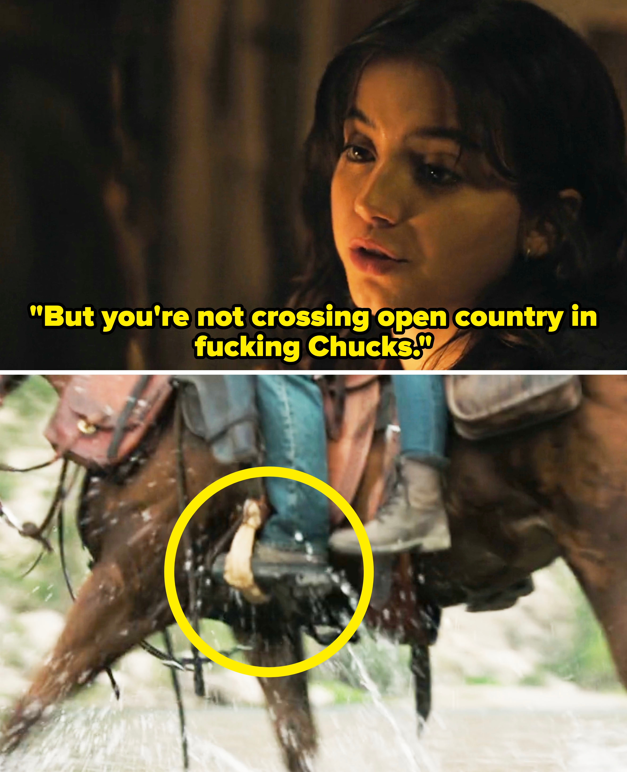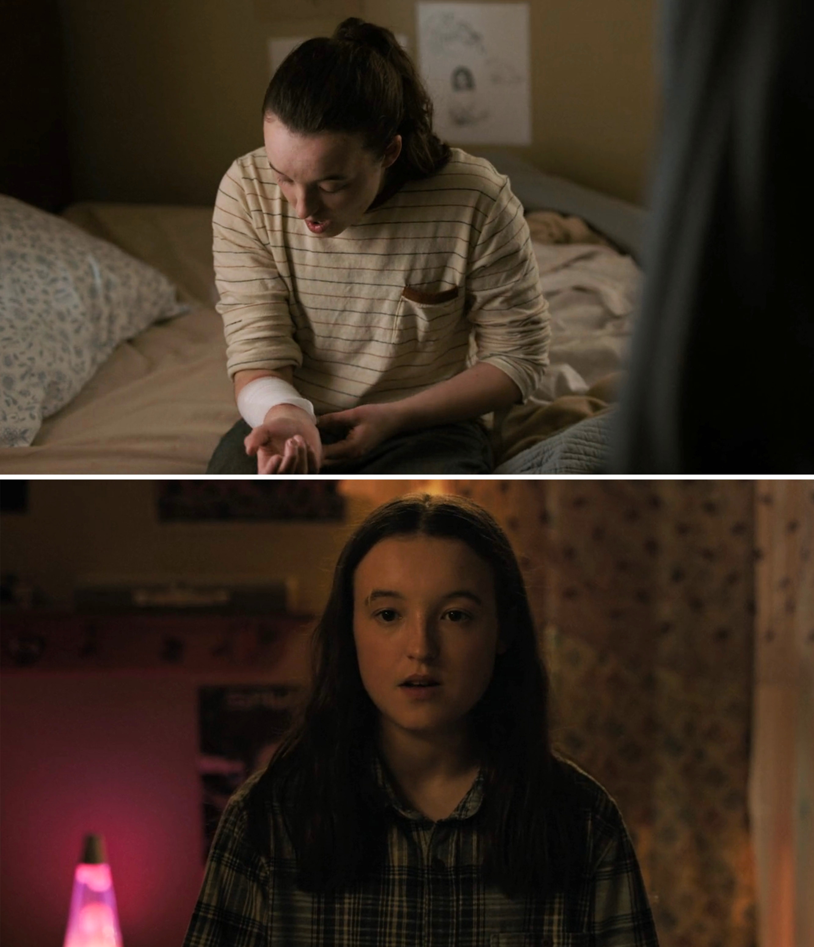 One change in Joel's costume design from "The Last of Us" Season 1 to Season 2 is that he tucks his shirts in now "like a dad would." There are obviously MASSIVE spoilers ahead for The Last of Us Season 2! She continued, saying, "They have such a great understanding of these characters, so it's always important to me to hear what they have to say and give them a voice in the fitting room. There's always wonderful conversations to be had with the cast." The tucked-in shirts are also meant to mirror Tommy, who is also a dad and leader in Jackson. Ann explained, "Tommy is the pillar of the community now, and sort of in charge with Maria, and Tommy's always got his shirts tucked in." Ann explained, "The jacket was really the only piece from Season 1 that made it. I felt like that was an iconic character piece to Joel, and it's something that the audience was going to remember." "When we saw in the script that it was going to be a jacket, we knew it had to be THAT jacket," Ann added. "Seeing that progression in one episode from Ellie as a 14-year-old turning 15-year-old teenager to a 19-year-old young woman," she continued. "So the pants are baggier, the T-shirts are longer and a little bit baggier. Then, as Ellie starts to grow up and become an adult, the jeans are a little slimmer in shape, the T-shirts are shorter in the body, even the hem on the T-shirt is a little bit shorter, and the silhouette of the shirts that she wears is also a little bit slimmer. So it's little things like that that help to show that age progression." She added, "I felt it was really important to show, like, the similarity between Joel and Ellie in their clothes and the things that they choose." Ann added, "I wanted there to be a sharp contrast between the two." Ann added, "When we knew it was going to be the Converse, that's when I went to Craig Mazin [the show's co-creator], and I said, 'I would really love to have some doodles on the shoes, and I would love to give a pair to Bella, see what they would do with them.' And he was also on board with that idea." She continued, saying, "I felt like it wasn't really, in a weird way, I know this is going to sound strange, but it kind of didn't feel like it was my business. It felt like as long as it was true to who Ellie was for Bella, then I was fine with it. It became something very personalized that Bella got to do with their costume." Ann also joked, "I mean, listen, as a costume designer, when I see that in the script that Ellie is wearing Converse in the snow, I'm like, this is just me as a costume designer, I'm like, 'Really?!'" She continued, saying, "That scene is so gorgeous, and it's right out of the game. I really felt it was important to try to stay as true to not only the colors that the characters were wearing in the game, but also the silhouette. This is an iconic look for Ellie, and we want it to stay as true to that iconic look as possible." Speaking about working with the props department on creating the iconic bracelet, Ann said, "I knew Nevin [Swain, prop master for Season 2] was a genius when it came to creating these props. So he had somebody who built the bracelet for us. I loved this bracelet. When I was starting prep on the show early, early on, I remember having a conversation with my friend's 16-year-old daughter, and she said, 'You have to promise me, Aunt Ann, that Dina's bracelet is going to make it into the show. Just please promise me.' And I was like, 'Okay, I promise it will.'" She continued, saying, "So it was really important to me to make sure I got that right for Noah because she was so passionate about it. Of course, it's a big part of the story as well, so there was no way it wasn't going to make it into the game, but the fact that Noah brought that to my attention made it even more special to me." She added, "My team, my breakdown team, who are all incredible artists, hand-screened the stripes onto a T-shirt." She said there were discussions about the fact that Aviator Nation didn't exist prior to the outbreak in The Last of Us. She said, "We discussed the fact that the Aviator Nation did not exist in our timeline. But as Craig and Neil have always said, it's all about serving the story, and what serves the story best, just like the Pearl Jam song 'Future Days.' That serves the story, doesn't matter if it was in our timeline or not. We had similar discussions about this jacket. It just felt like Dina." She continued, saying, "We wanted to try to find that perfect green that would look great in the forest, that would separate her enough so that you can see her. But also, so she kind of blends in a little bit, because that makes sense for who Ellie is." Explaining how the costume department made the jackets, Ann said, "We found the fabric. We stripped the fabric, overdyed the fabric, splayed into the fabric, and then the fabric goes to the workroom. They build the shell. Then, when the shell is done, it goes back to breakdown, where they wash it down to get those really great faded edges." She continued, saying, "Then it goes back to the workroom, where it's waterproofed, and then all the other things are added, like the fake fur that we used on the hood. Then once it's built completely, it goes back into breakdown for its final aged look, where they add dirt and grime and anything else that might need to go on there to make it look 20 years old." Ann recalled, "In the game, everybody's wearing lightweight jackets. I remember having this conversation with Ashley Swidowski, who's one of the game designers at Naughty Dog, and we talked about it, and we were like, 'This is great for the game, but not great in real life. So we're going to have to make these changes.' So everybody got parkas." Ann elaborated, saying, "We chose to go with a T-shirt here, just for practical reasons on set and for everything that was happening. Those were also larger conversations that we all had about, okay, this is what it was in the game, but we might