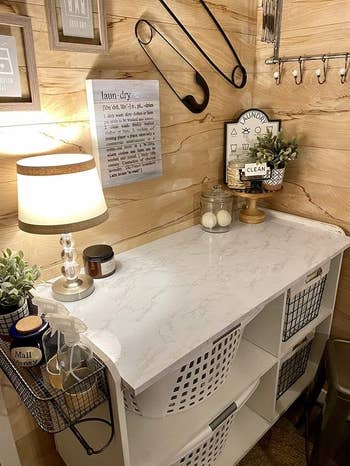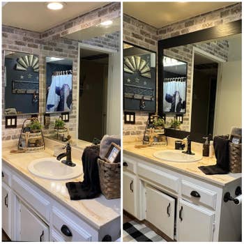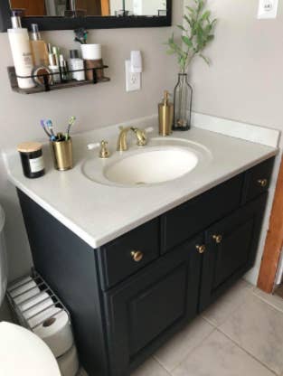 We hope you love our recommendations! While every product is independently chosen by our editors, BuzzFeed and our publishing partners may collect a share of sales or other compensation from the links on this page. You can read more about how our affiliate partnerships work in our Editorial Standards & Ethics Guide. After reading through this list, you'll be surprised at just how little money and effort it takes to give your home a whole new look. Promising review: "Where do I start? I absolutely LOVE this product. I wanted to replace our bathroom mirror, but due to its size, it would have cost a lot! I came across this on Amazon and decided to give it a try. The application process was super easy and applied without bubbles as long as you go slow and rub it down as you go. I kid you not. It looks like wood and feels like it, too! You can feel and see the 'wood grain.' It’s absolutely stunning and looks like I bought a whole new mirror." —Taylor Get it from Amazon for $8.99 (available in two sizes). Promising review: "This product is exactly what I was hoping for. It’s great quality. Looks so chic. Such a nice way to dress up a household necessity. Definitely worth it." —Kaylee Get it from Amazon for $6.99+ (available in three sizes and 13 colors). It took most reviewers less than an hour to completely revamp their desk, and it was two hours *tops* for others (depending on how much space you're redoing!). Psst — If you pick this up, check out this reviewer's great installation tips for applying it to a desk! Promising review: "I do not have the money for a new vanity right now. Insert DIY project of covering my ugly pink bathroom vanity in marble contact paper. It looks 100% better, and it’s super durable. It’s a little tricky to work with at first, and then you get the hang of it. I’m buying more for my half bath! Update: My vanity still looks great a couple of months later! I decided to do my tabletop in my laundry room [above, right], and it looks great too! Tips: Make sure there is nothing on the surface, as bumps will show through with the tiniest of debris. Also, one roll is not enough; always buy more than you think you’ll need!" —Natalie Lamb Get it from Amazon for $4.99+ (available in 10 sizes and seven colors). Promising review: "The countertop is just now starting to need (slight) touch-ups around the sink itself [a whole two years later]. I couldn't be happier with this product! This paint can be a little tricky to work with until you get the hang of how it applies. My suggestion would be to test it out on a scrap or something prior to applying. Once I had it, this product was a breeze to work with. We recently purchased a new home, and we're not gutting our main bathroom until next summer, and I just couldn't live with that 1980s green another day. So, after reading a lot of tutorials, I decided to go for it and paint the counter. I LOVE how it came out! Once it was dry for 24 hours, I applied several coats of poly and let it sit for 72 hours before I let the counter go back into normal use. It's held up like a dream. I wouldn't use any heavy chemicals on it (but I wouldn't advise those period), but otherwise zero issues with it. Side Note: I see a lot of negative reviews on this product because it doesn't hold up for people outdoors. USE A SEALANT. Don't blame a product if you don't use it correctly." —Dogmom20 Get it from Amazon for $13.18+ (available in five colors). Enhances the natural beauty and depth of grain on finished *and* unfinished wood. For use on antiques, dining tables, kitchen cabinets, wood doors and trim, etc. Promising review: "Very impressed so far. Just tried this stuff on one of our kitchen cabinets and it really did a nice job. The cabinets are 15-year-old cherry-stained hard work cabinets (oak, maybe?) and are scratched deeply in certain parts from the previous owner's dogs. 20 minutes after applying this product and wiping it off, I can't complain at all about the results. It looks great in the picture, and even better in real life, where you are not focusing on staring at imperfections. In addition to helping tremendously with the blemishes, it also leaves a nice glossy shine on the cabinets, making them look clean and fresh (not over-the-top glossy and fake). For the minimal price, I can't complain at all. Finally, I used about a 1/3 of an ounce to do the 36" double base cabinets and the 36" wide drawer, so I believe the 16-oz bottle will last quite a while." —Patrick Gallagher Promising review: "These are awesome! My son installed them with no problems. They look much more expensive than what they cost, function well, and I am so happy with this upgrade." —Gina C. Ashline Get a set of 30 five-inch pulls from Amazon for $29.99 (also available individually and in smaller and larger pack sizes). Promising review: "I live in an apartment community, and I wanted to find a solution to cover up my windows without using my blinds/curtains. Let me just say...wow! This beyond exceeded my expectations. Not only does it give me the privacy I need, but the way the lights reflect in the daytime AND nighttime is just breathtaking! In the morning, when the sun shines through, tiny little rainbows get cast all over the bedroom! At night, it looks so cozy, warm, and has a beautiful, realistic stained-glass look to it." —Katie Coyle Get a roll from Amazon for $8.99+ (available in 14 sizes and four colors). Promising review: "This reeded glass window film was very pretty when installed. Gave just the right amount of obscurity that still allowed in light but maintained privacy when viewing from the outside. I bought more of this and offered it to my son who is enjoying it at his apartment too. We used it on the bottom half of windows and kept the upper half of windows open, which was the exact problem this film solved. Lots of choices, too!" —Liza S Get it from Amazon for $5.99+ (available in 12 sizes). Promising review: "This SAVED me m