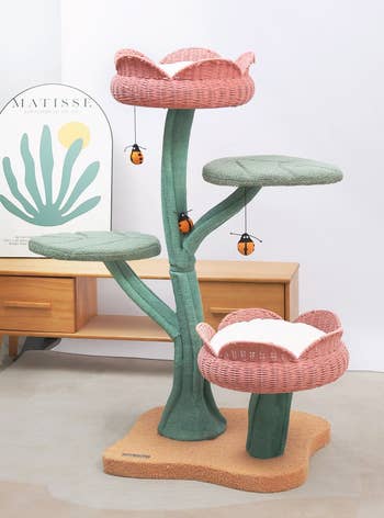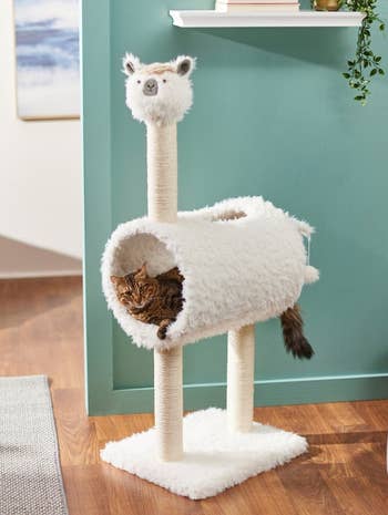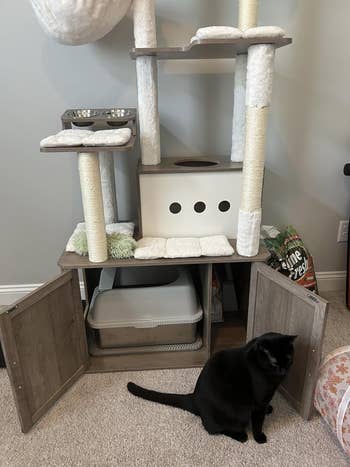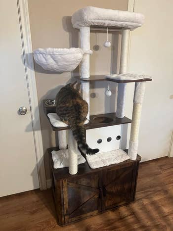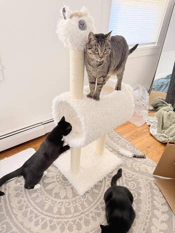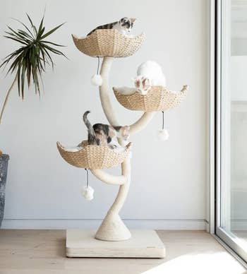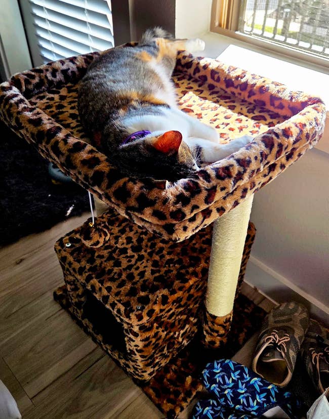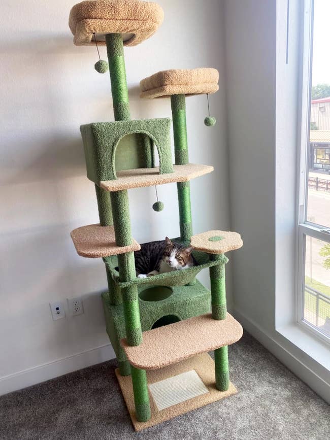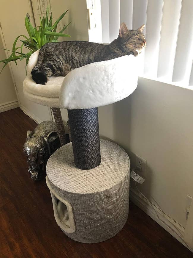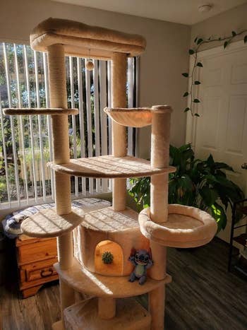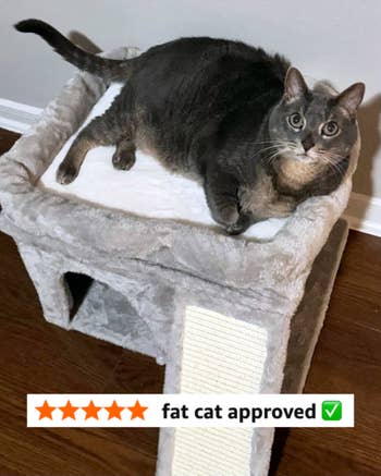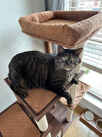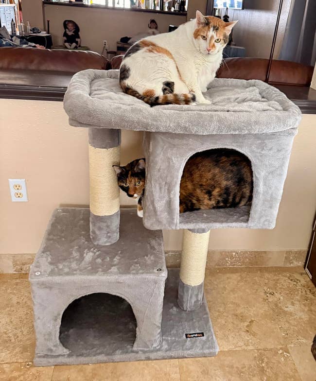 We hope you love our recommendations! While every product is independently chosen by our editors, BuzzFeed and our publishing partners may collect a share of sales or other compensation from the links on this page. You can read more about how our affiliate partnerships work in our Editorial Standards & Ethics Guide. "I have a chonky Ragdoll and this tower suits her magnificent stature, unlike some other towers that appear to have been made for kittens." Cats come in all shapes and sizes, and if your kitty is on the larger side, shopping for a cat tree that will actually support their stature can be difficult. You want a tree that will be stable and not wobble (or at least not tip over entirely when your cat runs and jumps on it at full speed), with features they can actually use, like wide perches and spacious cubby holes. Instead of staring at pictures of cat towers with fake, photoshopped cats on them and trying to figure out how big they actually are, let us help. These are the best cat trees for large cats, according to actual reviewers who own big breeds like Maine Coons and Ragdolls...or just regular kitties who are, well, a bit on the chonky side (that just means there's more to love). A Trixie Fonda XXL cat tree designed for large breeds, with a spacious cubby at the bottom and a wide perch on top. The cat pictured above, Simba, is 23 pounds — his owner says he fits inside the cubby, too! The slim, vertical design also makes it perfect for small spaces. Promising review: "Great for extra-large cats! This has been an instant hit with all of our fur babies. We have three large adult cats (16, 14, and 12 pounds) — everything is big here in Alaska! We also have one medium-sized kitten. We have it by one of our front windows and have a set of steps by it so the elderly cat can get up and sit there to watch the moose in our yard. The scratching posts are used a lot and have yet to fray! The top bed is large enough for the Maine Coon/Nebelung, and the house at the bottom is a perfect place to retreat from obnoxious kittens. I cannot say enough good about the quality, sturdiness and size of this cat perch." —Flymunkay A Feandrea cat condo with not one but *two* caves for your kitties to hide away in. The top perch is about as spacious as it gets when it comes to cat trees — one extra-large cat can sprawl out up there, or several large cats can snuggle up. And though the wide base should help prevent wobbling, the tree comes with an anti-tip kit for extra stability. I also love that this tree comes in more than just your usual black and beige options — the cream white and jelly pink shades are particularly cute! Promising review: "Great cat tree. It's big enough that both of my cats can lie on it together, and my 20-pound tom cat actually fits in the box, where he sleeps for hours. It holds up well to him jumping on and off of it without banging into the wall. They love the thistle rope scratchers and running and jumping on it." —Jessica S. Get the XL cat condo from Amazon for $67.48 (available in five colors and three smaller sizes). A heavy-duty Frisco XXL cat tree made for even the chonkiest cats, complete with *two* hidey holes they can actually squeeze into (see the cutie on the right above) and six platforms, including a large perch at the top they can use to survey their domain. Sometimes, their "domain" is just a one-bedroom apartment, but this over-6-foot-tall tree will give them so much more vertical space to enjoy! Promising reviews: "We’ve had this tree for a few years now, we have four cats and they absolutely love it! It’s HUGE and way sturdier than any cat tree I’ve ever had. Our almost 5-year-old [human child] has climbed on it a few times (he’s 35 pounds), and it is able to hold his weight effortlessly. Amazing quality and affordable price! If there was anything I could change about it, it would only be the quality of the scratching posts. Our cats have torn them to shreds." —Keirsten "I have a chonky Ragdoll and this tower suits her magnificent stature, unlike some other towers that appear to have been made for kittens." —Gretchen Get it from Chewy for $151.49 (available in two colors). A beautiful Mau Ivy 3 cat tree that'll last you many years, since every single part on the tree is replaceable, from the woven baskets to the sisal scratching material. Designed for cats up to 23 pounds, the Ivy 3 is super sturdy thanks to the square wooden base, which keeps it secure when cats jump on and off. And the woven baskets are large and supportive — enough to comfortably hold just about any cat, IMO. I've had the Ivy 3 for several years now, and it's held up beautifully despite heavy use from my two cats. It was a replacement for an older, cheaper cat tree, and I was ready to invest in something nicer. After extensive market research, I realized Mau had everything I was looking for: the quality and durability, the chic modern look, and the option to replace parts that my cats may eventually wear down with time. Also, you can purchase the cushions and pom-pom balls for your tower in different colors, with some really gorgeous shade options! Most importantly, though, my cats ADORE this tree. They took to it instantly and are in it every single day. Chicho loves to scratch on the sisal rope and also climb all the way up the tree, sometimes playfully swatting at his brother napping in one of the baskets. It's been the best purchase and makes my cats so happy. So if you're looking for something a little nicer, I can't recommend this brand more! Get it from Mau for $329 (available in two colors). A funky leopard-print cat condo — a "big cat"–inspired style appropriate for your own big cat. It's rare to find a cat tree with a design this cool and a sturdy frame that's actually supportive, too. Both the plush perch and the condo are super spacious, and the sisal scratching posts are nice and long for your kitty to flex their claws on. BuzzFeed Shopping writ