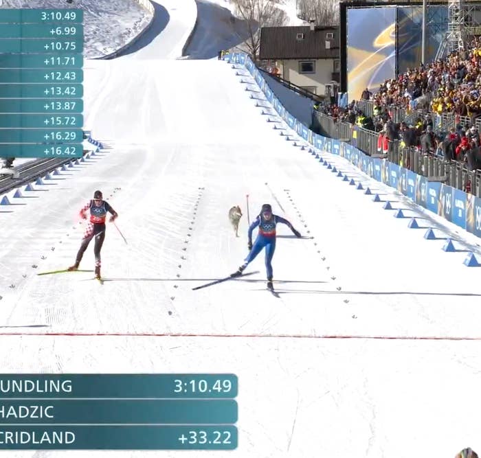 I truly can't believe this really happened. DOG ON THE COURSE AT OLYMPIC SKIING. π¨The late entry closes strong at the cross country finish line! pic.twitter.com/o4mO28tXXW
