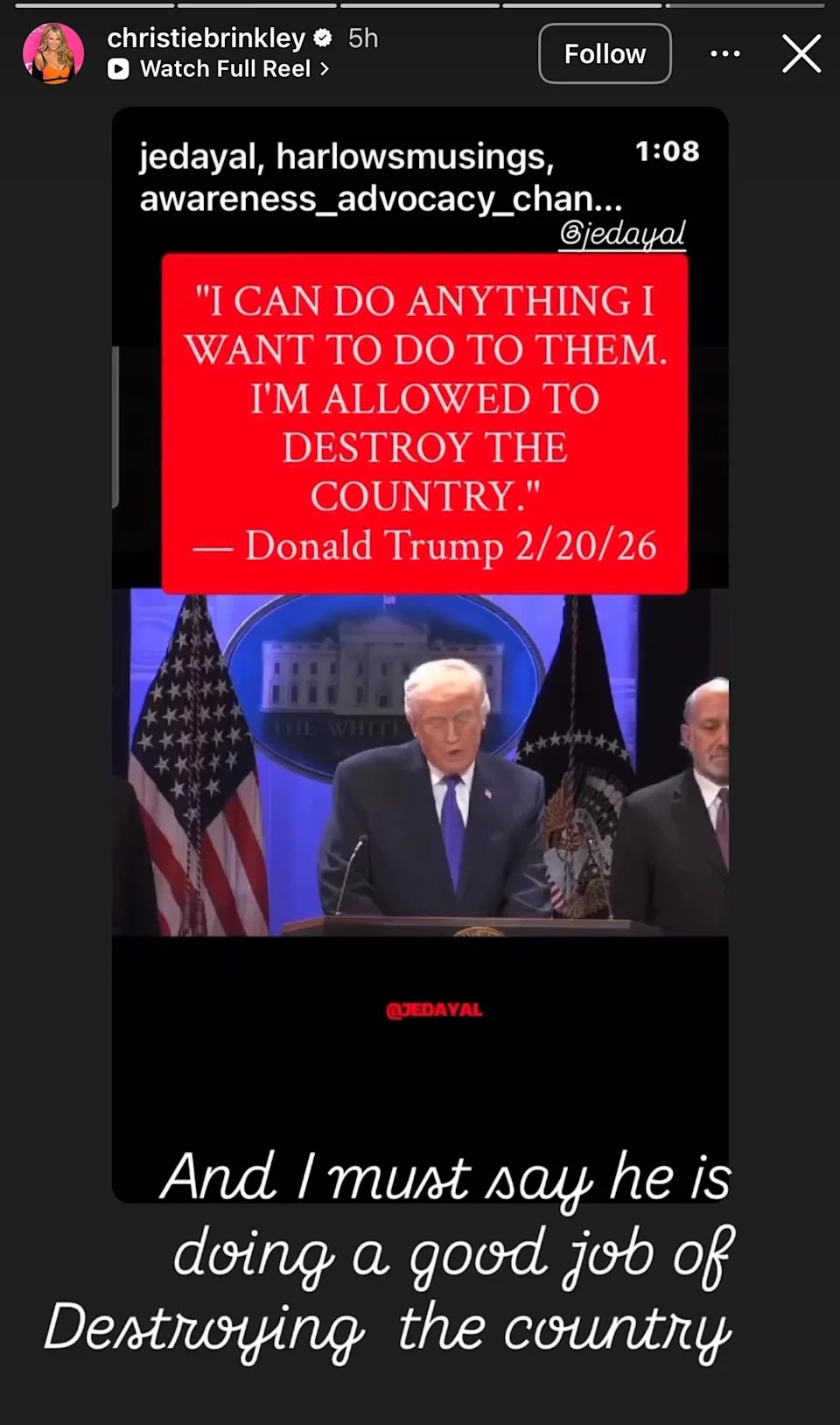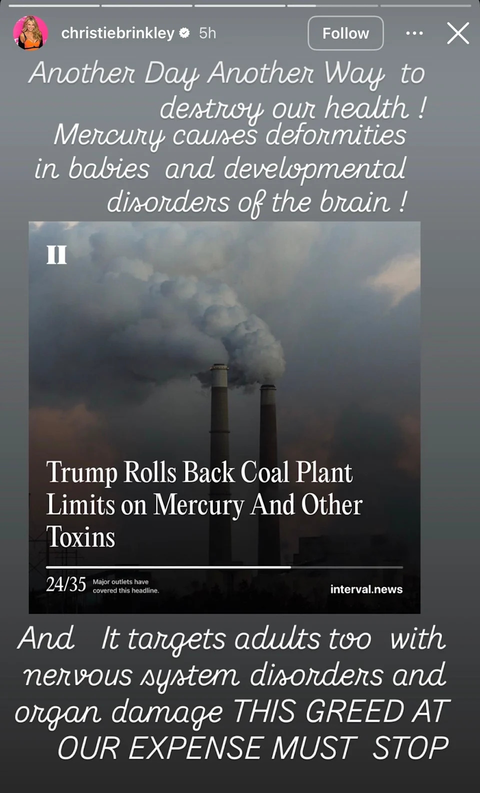 There is no love lost between Christie Brinkley and President Donald Trump, and she is not even subtle about it. After the intentions of Trump's administration on environmental regulations relating to coal and mercury emissions made headlines, the author wasted no time in raising her voice, assigning the blame, and highlighting the negative impacts to ensue. One thing Christie Brinkley will not do is watch in silence. She previously expressed her concerns about the issues with the environment when Donald Trump won the presidential elections in 2024. Brinkley seems distraught about the Trump administration's decision to ease pollution standards for limits on mercury from coal plants, and she has shared a piece of her mind. The author took to social media, writing that this environmental update is set to destroy lives. She noted the pressing side effects that will occur, affecting the fragile population, on her Instagram Stories. "Mercury causes deformities in babies and developmental disorders of the brain!" she penned over a screenshot of the headline from Interval News. In another slide, still on her stories update, she shared a quote which read "'I CAN DO ANYTHING I WANT TO DO TO THEM. I'M ALLOWED TO DESTROY THE COUNTRY.' -Donald Trump 2/20/26." To this, she added a footnote praising him for keeping up to the words in the quote. "And I must say he is doing a good job of destroying the country," the model shared after stating that the regulations not only put babies at risk, but they target adults too, affecting their nervous systems and ultimately causing organ damage. Brinkley claims Trump's decision is at the expense of the citizens and stems from greed. While the Trump administration views rolling back the clean air regulations from an economic standpoint, public health groups and environmental agencies warn that the health of the masses will bear the brunt. The announcement was made on Friday, February 20, 2026, stating that it will roll back clean air regulations limiting mercury and hazardous toxins from power plants. They shared that it will boost baseload energy. President Donald Trump's Environmental Protection Agency explained that easing the pollution standards would alleviate costs for utilities that run older coal plants. The effectiveness of this move shines at a time when demand for power is massively increasing, with the expansion of data centers used for artificial intelligence. Reuters reports that environmental groups have stated that allowing mercury, which is a neurotoxin capable of impairing brain development in babies, to be freely emitted into the air will result in higher health-related costs. Brinkley particularly noted earlier that the administration has set out to undo the environmental protection regulations put in place by Joe Biden's administration. The Swimsuit model added that the effects on the climate and health will surely take a devastating turn as a result. The Daily Mail shared that Brinkley wrote on social media, telling her followers that natural disasters and diseases will all intensify if the state of the planet is not placed at the top of a Scale of preference over profits for a handful of greedy corporations. She acknowledged that while the effects of climate change are already being felt, working together in prioritizing the environment will go a long way to slow down or ultimately stop the blistering negative effects. Brinkley called for support from her online community, stating that nature does not have respect for race or skin color, as no one will survive without a healthy biodiverse environment. The actress also admitted that the changes will not only affect the current population but also future generations as well. "For the sake and well-being of our children, action is mandated," her words echoed. Big stars in the music industry like Taylor Swift and Billie Eilish endorsed Trump's opponent, Kamala Harris, during the 2024 presidential elections. After it was announced that Trump won, Eilish called his victory a "war on women," seemingly referring to his take on female reproductive rights. Queen of Pop, Madonna, also expressed her views on the outcome of the election, uploading a photo on Instagram showing a cake with the words "F-ck Trump," adding that she stuffed her face with it after the results were announced. Madonna also shared that she was "trying to get her head around why a convicted felon, rapist, and bigot was chosen to lead the country because he's good for the economy?" Cardi B, along with other celebrities such as Christina Applegate and Lili Reinhart, also slammed his election win. The president also faced heat from the media as many voiced out their disappointment with the election results. Besides Brinkley's concerns with climate change and environmental regulations, she previously spoke out against Donald Trump, claiming that he had flirted with her when he was married to his first wife, Ivanna. Brinkley is all about effecting change in the environment and saving Mother Earth from devastating ruin. Still, an aspect of her life saw a painful nosedive, and it was not triggered by environmental destruction. In her memoir "Uptown Girl," released last year, she recounts the pain she went through when she discovered her fourth marriage had hit the rocks. She detailed how she discovered her ex-husband, Peter Cook, had cheated on her leading to the end of their eight-year marriage. The Blast reported that she described the relationship as the "most tortured relationship" she ever had. It was revealed to her that her then-husband was having an affair with a teenage girl. Upon searching their family computer, she further discovered some incriminating proof and adult content, as well as several explicit photos. The shock she felt was overwhelming when her eyes were met with the truth, and she ultimately decided the union could not continue. Will Christie Brinkley's voice cause a positive turnaround for the environment?