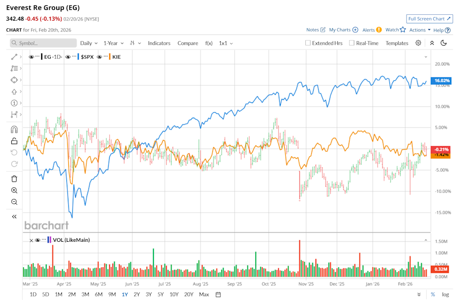 Hamilton, Bermuda-based Everest Group, Ltd. (EG) provides property, casualty, and specialty reinsurance and insurance solutions. It is valued at a market cap of $14.4 billion. This insurance company has underperformed the broader market over the past 52 weeks. Shares of EG have gained 1.3% over this time frame, while the broader S&P 500 Index ($SPX) has soared 11.7%. Meanwhile, on a YTD basis, the stock is up marginally, in line with SPX. If Palantir is Near a Bottom, What's the Best Play in PLTR Stock? NVDA Earnings, Tariffs and Other Key Things to Watch this Week Adobe (ADBE) Stock Has Been Beaten Up But the Smart Money Remains Resilient Markets move fast. Keep up by reading our FREE midday Barchart Brief newsletter for exclusive charts, analysis, and headlines. Zooming in further, EG has outpaced the State Street SPDR S&P Insurance ETF (KIE), which declined marginally over the past 52 weeks and dropped 4.1% on a YTD basis. On Feb. 4, EG delivered mixed Q4 results, and its shares dropped 2.3% in the subsequent trading session. Due to lower premiums earned, the company’s total revenue declined 4.6% year-over-year to $4.4 billion, but topped analyst expectations by 2.6%. On the other hand, its net operating income per share reached $13.26, up from an operating loss of 18.39 per share recorded in the year-ago quarter, yet missed consensus estimates by a slight margin. For fiscal 2026, ending in December, analysts expect EG’s EPS to grow 21.3% year-over-year to $54.01. The company’s earnings surprise history is disappointing. It missed the consensus estimates in three of the last four quarters, while surpassing on another occasion. Among the 19 analysts covering the stock, the consensus rating is a "Moderate Buy,” which is based on five “Strong Buy,” two "Moderate Buy,” 11 "Hold,” and one “Strong Sell” rating. The configuration is more bullish than two months ago, with two analysts suggesting a “Strong Sell” rating. On Feb. 12, Bob Huang from Morgan Stanley (MS) maintained a “Hold" rating on EG, with a price target of $330. The mean price target of $361.62 suggests a 5.6% potential upside from the current levels, while its Street-high price target of $430 suggests a 25.6% potential upside from the current levels. On the date of publication, Neharika Jain did not have (either directly or indirectly) positions in any of the securities mentioned in this article. All information and data in this article is solely for informational purposes. This article was originally published on Barchart.com