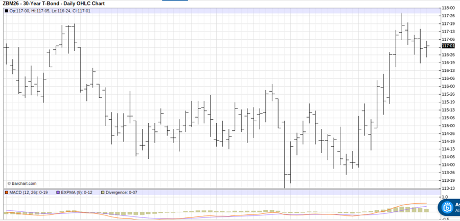 June U.S. T-Bond (ZBM26) futures present a buying opportunity on more price strength. See on the daily bar chart for June U.S. Treasury bond futures that prices are trending higher. See, too, at the bottom of the chart that the moving average convergence divergence (MACD) indicator is in a bullish posture as the blue MACD line is above the red trigger line and both lines are trending up. Bulls have the near-term technical advantage. If Palantir is Near a Bottom, What's the Best Play in PLTR Stock? NVDA Earnings, Tariffs and Other Key Things to Watch this Week Adobe (ADBE) Stock Has Been Beaten Up But the Smart Money Remains Resilient Get exclusive insights with the FREE Barchart Brief newsletter. Subscribe now for quick, incisive midday market analysis you won't find anywhere else. Fundamentally, the marketplace is presently pricing in two U.S. interest rate cuts this year, which is a bullish scenario for U.S. Treasury prices. Also, the geopolitical scene is still uncertain, which is driving “flight to quality” buying of U.S. Treasuries, which are still deemed by most investors as the safest asset to own during very uncertain times. A move in June T-Bond futures above chart resistance at 117 16/32 would become a buying opportunity. The upside price objective would be 121 16/32, or above. Technical support, for which to place a protective sell stop just below, is located at 116 even. IMPORTANT NOTE: I am not a futures broker and do not manage any trading accounts other than my own personal account. It is my goal to point out to you potential trading opportunities. However, it is up to you to: (1) decide when and if you want to initiate any trades and (2) determine the size of any trades you may initiate. Any trades I discuss are hypothetical in nature. Here is what the Commodity Futures Trading Commission (CFTC) has said about futures trading (and I agree 100%): Trading commodity futures and options is not for everyone. IT IS A VOLATILE, COMPLEX AND RISKY BUSINESS. Before you invest any money in futures or options contracts, you should consider your financial experience, goals and financial resources, and know how much you can afford to lose above and beyond your initial payment to a broker. You should understand commodity futures and options contracts and your obligations in entering into those contracts. You should understand your exposure to risk and other aspects of trading by thoroughly reviewing the risk disclosure documents your broker is required to give you. On the date of publication, Jim Wyckoff did not have (either directly or indirectly) positions in any of the securities mentioned in this article. All information and data in this article is solely for informational purposes. This article was originally published on Barchart.com