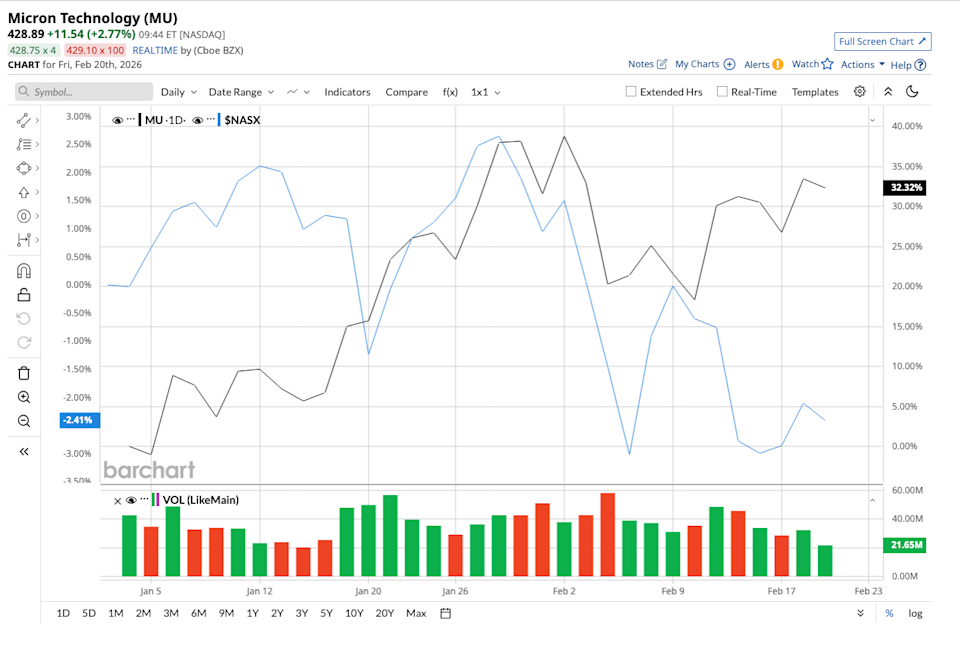 Amid the broader tech selloff, Micron (MU) stock is climbing, driven by an outstanding start to fiscal 2026. Micron’s core products, DRAM, NAND flash, and high-bandwidth memory (HBM) used in AI data centers, are in very high demand. This has boosted the company’s revenue, margins, and earnings in the first quarter of fiscal 2026. While the tech-heavy Nasdaq Composite Index ($NASX) is down 2.4%, MU stock is up 32.3% so far this year and has beaten the overall market. And many analysts believe it can surpass its 52-week high and reach $500 this year. With a market cap almost touching $500 billion, Micron has become a strong contender in the semiconductor space. Analysts at Deutsche Bank, Phillip Securities, and Rosenblatt Securities all anticipate MU stock will keep climbing and touch $500 by the end of 2026 as demand for its products remains high. If Palantir is Near a Bottom, What's the Best Play in PLTR Stock? NVDA Earnings, Tariffs and Other Key Things to Watch this Week Adobe (ADBE) Stock Has Been Beaten Up But the Smart Money Remains Resilient Markets move fast. Keep up by reading our FREE midday Barchart Brief newsletter for exclusive charts, analysis, and headlines. Micron Technology designs and manufactures memory and storage chips that power data centers, AI systems, PCs, smartphones, cars, and other electronic devices. In the most recent first quarter of fiscal 2026, Micron reported revenue of $13.6 billion, an increase of 57% year-over-year (YoY), marking its third consecutive quarterly revenue record. Adjusted earnings surged 167% YoY to $4.78 per share. DRAM revenue alone contributed 79% of total revenue and grew 69% YoY to $10.8 billion. NAND revenue also increased 22% YoY to $2.7 billion. In fact, Micron's data center NAND portfolio generated over $1 billion in revenue during the quarter. The G9 node is ramping up with strong yields, and management predicts it will become the company's largest NAND node later in fiscal 2026. HBM remains Micron's primary growth engine. The company has finalized pricing and supply commitments for all of its 2026 HBM production, including its top-tier HBM4 product, which offers speeds exceeding 11 gigabits per second. Production of HBM4 is scheduled to ramp up in the second half of 2026, with strong yield performance anticipated. The HBM total addressable market (TAM) is expected to increase at a 40% CAGR until 2028, reaching over $100 billion. Micron is in a leading position to capitalize on this growth. The company generated $3.9 billion in free cash flow, allowing it to pay down its debt by $2.7 million and end the quarter with $12 billion in cash and investments. Management believes that memory is critical to AI cognitive capabilities, as AI data center build-outs drive large increases in demand for high-performance memory and storage. Despite heavy competition from rivals such as Samsung (SMSN.L.EB), Micron is ramping up advanced nodes, increasing global manufacturing, and signing multiyear deals and has a better competitive position. For calendar year 2026, Micron expects both DRAM and NAND industry bit shipments to increase around 20%, constrained by supply. Management indicated that over the medium term, the company may only be able to fulfill roughly half to about two-thirds of the demand coming from certain major customers. And to address this tight supply, Micron plans to increase fiscal 2026 capital expenditure to roughly $20 billion, up from a prior estimate of $18 billion. The focus is now on accelerating equipment installations and construction timelines. The first wafer output at its Idaho fab could be ready by mid-calendar 2027, earlier than previously anticipated, with construction on a second Idaho fab to begin in 2026, with operations targeted for 2028. Additionally, a New York fab could break ground in early 2026, with supply coming online in 2030 and beyond. For the second quarter, Micron expects revenue of $18.7 billion (plus or minus $400 million), which will represent an increase of 132.3% YoY. Gross margin could be around 68%, and adjusted earnings could be around $8.42 (plus or minus $0.20) per share, representing a staggering increase of 439.7%. Management expects gross margins to expand further through the other quarters of fiscal 2026, though at a more gradual pace. The company even anticipates significantly higher free cash flow YoY in fiscal 2026, even though capital spending could be more towards the second half of the year. Analysts who cover Micron forecast exceptional growth over the next two fiscal years. In fiscal 2026, revenue is expected to increase by 103.8% to $76.1 billion, followed by a 28.1% YoY increase in fiscal 2027. Similarly, earnings could climb by a staggering 309.1% in fiscal 2026, followed by another 31.3% in fiscal 2027. Micron stock is currently trading at 12 times forward earnings, which is low even though analysts expect massive growth. This could be because the memory industry is cyclical. Second, much of the AI enthusiasm and premium valuation has gone to chip makers, while memory suppliers have been overlooked. But eventually, Micron’s valuation might catch up, making it a cheap AI stock to grab now. With AI driving demand across data centers, PCs, smartphones, automotive, and industrial markets, memory is becoming increasingly important to computing performance. And Micron appears poised to deliver sustained revenue growth, expanding margins, and strong free cash flow through fiscal 2026 and beyond. If this rate of growth continues, there is a possibility MU stock can even cross its high price target of $500. Overall, Wall Street also remains strongly bullish about MU stock. Out of the 42 analysts covering MU, 33 rate it a “Strong Buy,” six rate it a “Moderate Buy,” and three recommend a “Hold.” The stock has surpassed its average target price of $350.45. On the date of publication, Sushree Mohanty did not have (either directly or indirectly) positions in any of th