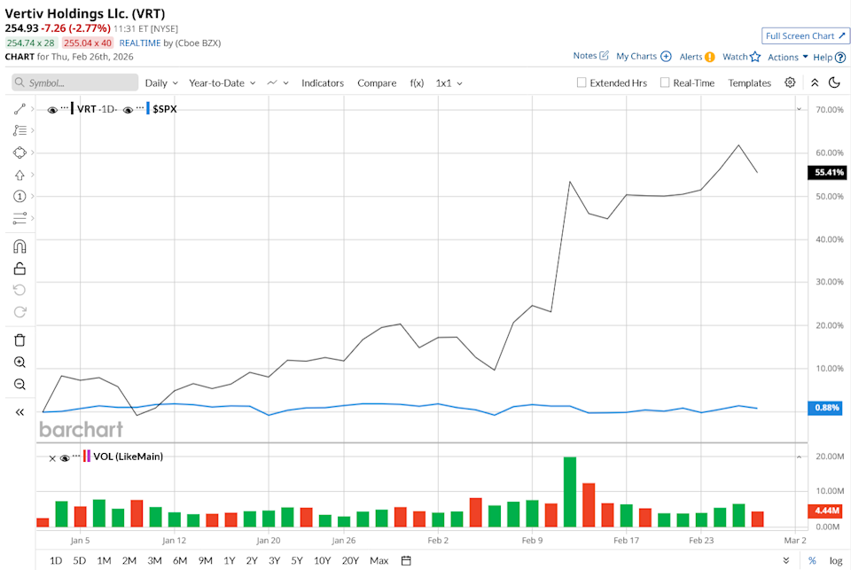 The AI investment cycle has now entered a more selective phase. Investors are no longer chasing the bigger AI names with lofty valuations, especially when earnings growth is struggling to justify these premium valuations. The focus is now shifting to high-quality infrastructure players like Vertiv Holdings (VRT), which are powering the AI revolution behind the scenes. VRT stock has returned 1,502% over the last three years and is up 52% so far this year, while the Magnificent Seven have slumped. Vertiv may be a tempting growth opportunity for investors looking for smarter AI bets under $300. 3 Highest Rated Dividend Kings for Generations of Income As Nvidia Launches New AI Laptop Chips, Should You Buy NVDA Stock? GE Aerospace Is Linking Up with Palantir. Should You Buy GE Stock Here? Tired of missing midday reversals? The FREE Barchart Brief newsletter keeps you in the know. Sign up now! Valued at $100.3 billion, Vertiv provides critical infrastructure such as power systems, thermal management solutions, integrated prefabricated infrastructure, and lifecycle services to enable data centers to operate securely and efficiently. Vertiv is experiencing explosive order growth, allowing its customers, including Amazon (AMZN), Microsoft (MSFT), and Google (GOOGL), as well as telecom carriers such as AT&T (T) and Verizon Communications (VZ), to build AI-ready capacity more quickly. Organic orders increased 152% year-on-year (YoY) in the fourth quarter. Over the trailing twelve months, organic orders grew 81%, and the company reported a book-to-bill ratio of 2.9 times. Vertiv's backlog now stands at $15 billion, indicating that the company has already received confirmed orders and will fulfill them over the following 12 to 18 months. This implies unrealized revenue in the upcoming quarters. For growth investors, this enormous backlog indicates that demand is not just spiking briefly. In fact, Vertiv's customers have committed to long-term infrastructure investments that will result in predictable earnings. The company’s geographic diversity reduces reliance on a single market, allowing Vertiv to exploit global AI infrastructure demand. According to the management, while growth in China remains restrained, it is rising in other parts of Asia, particularly India and other emerging markets. For the full year, Vertiv reported net sales of $10.2 billion, an increase of 26%. It’s not just the top line that is strengthening, but pricing power and operating leverage have also boosted adjusted diluted EPS to climb 47% YoY to $4.20. Beyond hardware, Vertiv’s service portfolio acts as a source of recurring revenue. As AI data centers grow more complex, fluid management, thermal balancing, and reliability optimization become increasingly critical. The company generated $1.9 billion in adjusted free cash flow (FCF) for 2025, leaving plenty of room for reinvestment, acquisitions, and shareholder returns. Vertiv has a debt-to-equity ratio of 0.74, indicating that the firm does not rely heavily on debt to fund its operations. With a strong free cash flow balance and expanding margins, this debt looks manageable rather than risky. Furthermore, Vertiv aims to generate $2.2 billion in adjusted FCF in 2026, despite raising capital expenditures to 3% to 4% of sales to expand capacity and support future growth. This should help manage the debt. In 2026, management expects 28% organic growth in sales to $13.5 billion. Adjusted EPS is expected to increase by 43% to $6.20 at the midpoint. Analysts expect rapid expansion over the next two years, with earnings increasing by 46% in 2026, followed by another 28.8% in 2027. The AI-driven infrastructure buildout is accelerating, and the industry is still in the early stages of its growth cycle. There could be sustained demand for Vertiv’s power and cooling systems in those facilities. Currently, Vertiv is trading at a forward price-to-earnings (P/E) multiple of 33x. The premium valuation implies the market already expects strong growth. Long-term investors who believe AI infrastructure spending will remain robust for years may find the current valuation justified by sustained earnings expansion. However, risk-averse investors might want to accumulate shares during market pullbacks. On Wall Street, VRT stock holds an overall rating of “Strong Buy.” Of the 24 analysts covering the stock, 18 rate it as a "Strong Buy," two call it a "Moderate Buy," three recommend a “Hold,” and one has a “Strong Sell” rating. VRT stock is trading just below its average target price of $257.31. However, its high price estimate of $305 indicates a possible 20% rally over the next 12 months. On the date of publication, Sushree Mohanty did not have (either directly or indirectly) positions in any of the securities mentioned in this article. All information and data in this article is solely for informational purposes. This article was originally published on Barchart.com