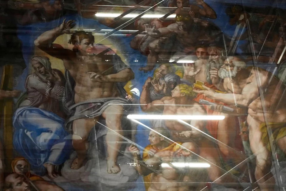 VATICAN CITY (AP) — Michelangelo’s “The Last Judgement” is getting a facial, with restorers removing a chalky white film of salt that has accumulated over the Renaissance masterpiece since its last major renovation three decades ago. The Vatican on Saturday gave the media a sneak peak to the cleaning operation, which is taking place on a floor-to-ceiling scaffolding that has obscured the imposing fresco of heaven and hell that dominates the front of the chapel. The cleaning operation is expected to be completed by Easter, in the first week of April. The public can continue to visit in the meantime, but will have to settle for a reproduction of “The Last Judgment” superimposed on a screen that covers the scaffolding. Vatican Museum officials on Saturday described a simple but important cleaning operation to remove the white film of salt that has accumulated on the fresco thanks to the nearly 25,000 people who pass through the Vatican Museums each day. “This salt is created because, above all, when we sweat, we emit lactic acid, and unfortunately lactic acid reacts with the calcium carbonate present on the wall,” said Fabio Moresi, in charge of the scientific research team at the Vatican Museums that is overseeing the cleaning. Climate change also has a role to play, since the visitors who do come tend to sweat more, creating even more humidity that reacts with the fresco, he said. Vatican Museums chief Barbara Jatta described the film as a “cataract” that is easy enough to remove: Restorers dip sheets of Japanese rice paper into distilled water and apply them to the fresco, and carefully wipe away the salt film. Viewed up close on Saturday on the scaffolding, the difference between before and after is remarkable: Sections of the fresco that haven’t been cleaned look as if they are coated in a chalky dust; the cleaned sections show the vibrant colors and detail of the original. On the figure of Jesus, for example, at the center of the fresco, a privileged visitor can see how Michelangelo painted his hair and the wounds of his crucifixion. The Sistine Chapel is named after Pope Sixtus IV, an art patron who oversaw the construction of the main papal chapel in the 15th century. But it was a later pontiff, Pope Julius II, who commissioned Michelangelo to paint the famous ceiling, the “Creation of Adam” showing God’s outstretched hand, between 1508 and 1512. A later pontiff, Pope Clement VII, commissioned Michelangelo in 1533 to return to paint “The Last Judgment.” The other frescos of the Sistine Chapel, where Pope Leo XIV was elected in May, undergo yearly cleaning with restorers working at night on cherry-pickers that can be removed each morning before the public arrives. But such machines can’t access all of “The Last Judgement,” since the fresco is located behind the altar, which is itself raised up marble steps. That logistical impediment required the mounting of a fixed scaffolding to access the full fresco to clean it. The Sistine Chapel underwent a complete restoration between 1979 and 1999, when centuries of smoke, grime and wax buildup was removed. The Vatican has left small patches of the pre-restored fresco intact to show the difference, which are now visible on the upper floors of the scaffolding and show a nearly blackened wall. Rather than radically reduce the number of visitors who can access the Sistine Chapel, the Vatican is studying ways to address humidity levels, through filtration systems and other technologies, so that the salty film doesn't form again. ___ Associated Press religion coverage receives support through the AP’s collaboration with The Conversation US, with funding from Lilly Endowment Inc. The AP is solely responsible for this content.