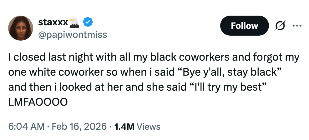 "why do parents bust in your room like they want to catch you cheating on them with another pair of parents?" Hi, Iโm Michaela Bramwell, and I'm a Junior Staff Writer here at BuzzFeed, covering everything trending news, from your latest viral TikTok to the chaos of today's politics. Editor's Note: While we can't endorse what X has become, we can bring you the worthwhile moments that still exist there, curated and free of the surrounding chaos. me sliding out of black history month and into women's history month because my intersection crosses a multi-lane highway... pic.twitter.com/2XFF8W0xun Melanin March tomorrow https://t.co/dg8DrjgdZ8 pic.twitter.com/qRk9sb477K I'm Actually In Physical Pain From Laughing At These 17 Black Twitter Tweets That Completely Made This Week