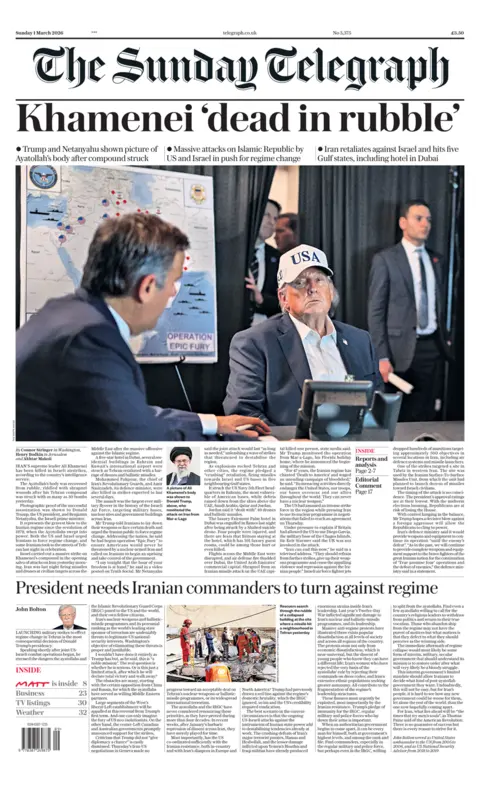 The front pages carry images of fiery explosions as - according to the Sunday Express - "chaos erupted" across the Middle East. The world is holding its breath, the paper says, after what it describes as "devastation" in the region. "Middle East in flames" is the headline in the Sunday Mirror, while the Sun on Sunday opts for simply: "Ayatollah dead". It says that following a "missile blitz" by the US and Israel the Iranian leader's body was found in rubble at his palace in Tehran. According to the Sunday Telegraph, Ayatollah Ali Khamenei's death "represents the gravest blow to the Iranian regime" since the 1979 Islamic Revolution. In comments highlighted by the Sunday Times, US President Donald Trump says it marks "the single greatest chance" for the regime to be overthrown, urging the Iranian people to "take back their country". One student in the city of Isfahan tells the paper that the government is more afraid of protesters than the US or Israel. But the Observer describes the strikes as "a war begun with no plan for peace" by a "dangerously reckless" president. Politico suggests the killing of the Ayatollah leaves a "power vacuum" which "plunges Iran's future into uncertainty". The website says that the armed forces "could use the opportunity to take more power", which would mean Iranians "could continue to face repression". The London-based Iran International – which the regime has classed as a terrorist organisation – says the strikes have intensified "disarray and confusion" within the country's military. Sources tell the outlet that the Revolutionary Guard Corps is insisting on the "swift appointment" of the next supreme leader, outside the normal procedures. As for Trump's view of Iran's future, he has spoken to the American news website, Axios - comments it says "offer the first real window into his thinking about how this ends". He tells the outlet that he can "go long and take over the whole thing, or end it in two or three days", and tell the Iranians that if they rebuild their nuclear programme he will "see them in a few years". He also says that one of his reasons for launching Operation Epic Fury was his belief that Tehran "didn't really want" to agree a deal over the programme. The Telegraph, however, speculates that Trump may have had another motive for the strikes - saying their timing is "no coincidence". It reports that at a time when his approval ratings are at their lowest he "hopes a decisive blow against a foreign aggressor will allow the Republicans to cling to power" in the forthcoming midterms. The Times points out that he "came into power promising to end US entanglement in forever wars". It describes the strikes as his "most daring act yet", but adds that "they must succeed". Sign up for our morning newsletter and get BBC News in your inbox.