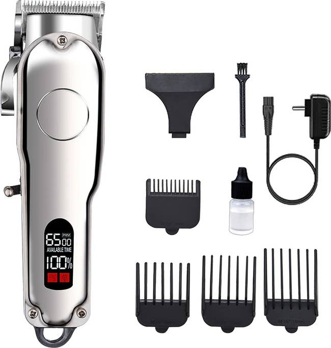 The set includes a hair clipper, manual, four limit combs, an adapter, a cleaning brush, and lubricating oil.