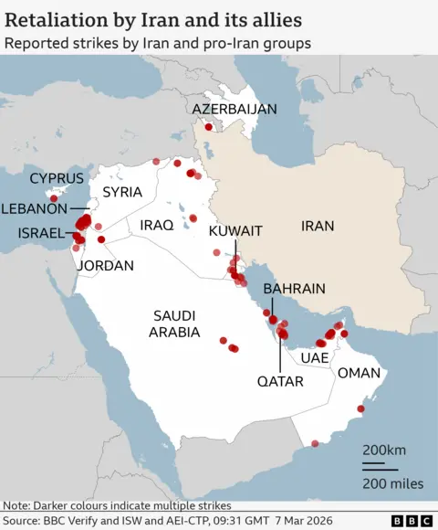 Explosions have rocked Tehran's Mehrabad airport with eyewitnesses reporting a burning plane on the tarmac, as the US-Israeli war with Iran continued for an eighth day. The attack comes after the Israel Defense Forces (IDF) said it had completed "an additional wave of strikes" targeting the Iranian regime's infrastructure. Iran has continued its attacks. There were air raid sirens in Jerusalem and Tel Aviv overnight as Israelis faced incoming ballistic missiles and drones. Most appear to have been shot down by Israel's air defence system. In the United Arab Emirates (UAE), video footage showed an explosion within the perimeter of Dubai International Airport, the result of an apparent drone strike. The US-based Human Rights Activists News Agency (HRANA) says 1,168 civilians are reported to have been killed in Iran since 28 February. Six American military personnel have been killed since the conflict began, according to the US Department of Defense. The first US-Israeli strikes on Iran began on 28 February with Israel's military saying it had targeted Iran's leadership and military infrastructure. The former Supreme Leader of Iran, Ayatollah Ali Khamenei, was killed in Tehran during the initial wave of strikes. The Israeli military said it had begun a 15th wave of attacks on Friday targeting Iranian "regime infrastructure" in Tehran and Isfahan. The announcement followed a night of heavy bombardment in the Iranian capital. The IDF released a video which it said showed the destruction of an underground bunker which was intended to be used by Iran's supreme leader. Fifty fighter jets were used in the raid, it added. BBC Verify has so far confirmed visual evidence of more than 80 attacks across the whole of Iran, including over 40 strikes in Tehran Satellite imagery reviewed by BBC Verify shows at least 11 Iranian naval vessels have been damaged or destroyed by US and Israeli strikes on the Konarak and Bandar Abbas naval bases since the war began. Other satellite imagery has revealed damage to at least three Iranian missile sites and the nuclear facility at Natanz. In Minab, in the south of Iran, at least 168 people including children were killed at a girls' school when it was hit on Saturday, Iranian authorities said. Two buildings can be seen in satellite imagery - an Iranian Revolutionary Guard Corps base has been completely flattened and the school building has partially collapsed. Analysis of the imagery reveals multiple strikes and burn marks around the school suggesting it was hit more than once. Israeli forces have also carried out air strikes in Lebanon targeting Hezbollah, the militant group that has long been backed by Iran. Hezbollah launched missiles towards Israel on 2 March following the killing of Khamenei. Tens of thousands of people evacuated their homes on Thursday after the IDF issued an evacuation warning for the southern suburbs of the Lebanese capital, Beirut. Israel's military said on Friday it had hit a Hezbollah command centre and a drone depot in Lebanon. A missile attack on 1 March, which Israel said came from Iran, killed at least nine people and injured 27 others in the city of Beit Shemesh, according to emergency services. As well as launching missiles at Israel, Iran has mounted attacks on US bases and embassies in the Middle East. It has also been accused of attacking infrastructure and civilian sites in the Gulf states Defence officials in the UAE said on Friday its forces had destroyed nine ballistic missiles. The country - which includes the popular tourist destination of Dubai - has faced almost daily missile and drone attacks since 28 February. Qatar, Bahrain, Kuwait and Saudi Arabia also reported coming under drone and missile attacks on Friday. On Sunday, six US soldiers were killed after a drone "evaded air defences" and hit a command centre at Port Shuaiba in Kuwait, the Department of Defense confirmed. Other incidents reported across the Middle East in recent days include: The US-Israeli war with Iran has also spread beyond the Middle East. On Thursday, Azerbaijan accused Iran of launching drones that injured two people in the western territory of Nakhchivan near the Iranian border. Iran denied the claim but Azerbaijan's President Ilham Aliyev called for Tehran to be held "accountable". US Defense Secretary Hegseth said on Wednesday a US submarine had sunk an Iranian warship "in international waters". The Iris Dena, which was thought to have around 130 people on board, was hit by a torpedo in the Indian Ocean off Sri Lanka. Eighty-seven sailors were killed, Sri Lankan officials said, while 32 were being treated for minor injuries. The UK has said a Royal Navy warship will sail to Cyprus after an Iranian drone crashed into the RAF base at Akrotiri on Sunday. Two more drones were intercepted on Monday, the Cypriot government said. A French warship is now in position off Cyprus while Spain has said it will deploy a frigate to the area. This story is being updated daily by BBC Verify. In an interview, the Oscar-nominee danced into some online controversy after claiming no one cares about ballet and opera. Video filmed by a witness and verified by the BBC shows a drone crashing close to the airport. A series of tornadoes tore through several cities, uprooting trees and destroying homes. Analysis suggests one of three F-15Es shot down on the war's second day came from RAF Lakenheath. Ordinary Iranians reflect on seven days of conflict and where they see their country going next.