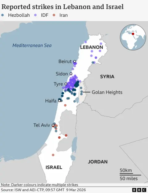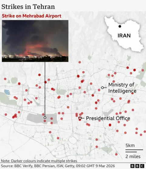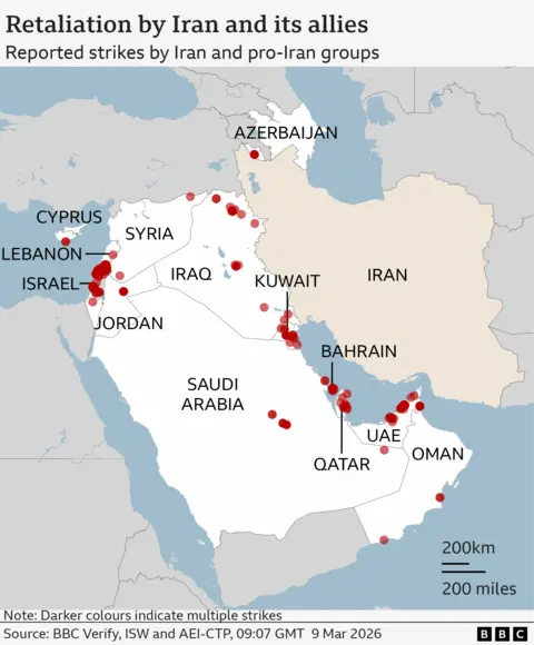 The Israeli military says it has targeted Iranian missile sites in overnight attacks and heavy explosions have been heard in the capital Tehran, as the US-Israeli war with Iran continues for a tenth day. Iran, meanwhile, has carried out further missile and drone strikes targeting Israel and the Gulf states. Officials in Bahrain say an Iranian drone attack south of the capital, Manama, wounded at least 32 people. The country's energy company also reported that a drone attack caused a fire at its largest oil refinery. Qatar, Kuwait, the United Arab Emirates (UAE) and Saudi Arabia reported new attacks overnight. In Israel, emergency services said one woman was injured by flying debris following an Iranian missile attack. The US-based Human Rights Activists News Agency (HRANA) says 1,205 civilians are reported to have been killed in Iran since 28 February. Seven US service personnel have been killed since the start of the conflict, according to the Department of Defense. The first US-Israeli strikes on Iran began on 28 February with Israel's military saying it targeted Iran's leadership and its military infrastructure. The former Supreme Leader of Iran, Ayatollah Ali Khamenei, was killed in Tehran during the initial strikes. On Sunday evening the Israel Defense Forces (IDF) said "approximately 3,400 strikes" had been carried out so far with more than 150 Iranian defence systems disabled. BBC Verify has seen footage of smoke and fires at four Iranian oil facilities. IDF spokesman Lt Col Nadav Shoshani said such sites were a "legal, military target" Iran's foreign ministry said the strikes had released "hazardous materials and toxic substances into the air" and accused Israel of "poisoning civilians". BBC Verify has so far confirmed visual evidence of more than 110 attacks across the whole of Iran, including at least 49 strikes in Tehran. Satellite imagery reviewed by BBC Verify since the conflict began on 28 February has shown: In Minab, in the south of Iran, at least 168 people including children were killed at a girls' school when it was hit on 28 February, Iranian authorities said. Two buildings can be seen in satellite imagery - an Iranian Revolutionary Guard Corps base has been completely flattened and the school building has partially collapsed. Analysis of the imagery reveals multiple strikes and burn marks around the school suggesting it was hit more than once. Israeli forces have carried out air strikes in Lebanon targeting Hezbollah, the militant group that has long been backed by Iran. Hezbollah launched missiles towards Israel on 2 March following the killing of Khamenei. Israel said it carried out a "precise strike" on the Lebanese capital Beirut on Sunday targeting commanders from the Quds force - the foreign operations arm of Iran's Revolutionary Guards. The Lebanese health ministry said four people died in an Israeli strike on a hotel in central Beirut. According to the health ministry, 394 people have been killed in the past week from Israeli strikes. A missile attack on 1 March, which Israel said came from Iran, killed at least nine people and injured 27 others in the city of Beit Shemesh, according to emergency services. On Monday, the the IDF it was striking Hezbollah infrastructure in the Dahieh area of Beirut. An IDF spokesman earlier urged people to evacuate, saying they will "act forcefully" against "terrorist infrastructure". The governments of Saudi Arabia, Kuwait, Bahrain and the UAE all reported what they said were Iranian missile and drone attacks on Sunday. Kuwait said it contained a major fire in a government office block following a reported attack during the early hours of the morning. The UAE said its air defences intercepted 16 ballistic missiles and 113 drones on Sunday. The latest attack came after an apparent drone strike hit Dubai International airport on Saturday. The UAE said that in the past week 238 missiles and 1,422 drones had been launched at the country. On Monday 9 March, Bahrain said a drone attack injured 32 civilians - the highest number of casualties in a single incident in the Gulf states since the war began. Oman, Qatar, Saudi Arabia and Iraq have also come under attack since the war began on 28 February. Shipping in the Gulf has been severely disrupted after Iran threatened to "set fire" to vessels in the Strait of Hormuz through which 20% of the world's oil and gas flows. The US-Israeli war with Iran has also spread beyond the region. This story is being updated daily by BBC Verify. India says Tehran sought permission to dock three ships on the day the US and Israel began a war on Iran. Concern has grown for team after one critic called them 'wartime traitors' for failing to salute during the Iranian anthem. Fuel depots were hit in Tehran and Karaj overnight, with videos showing huge fires and plumes of smoke in multiple locations. A suspect was arrested after the shooting on Sunday afternoon, Los Angeles officers say. Mojtaba Khamenei is expected to continue the hardline rule of his father, who was killed in US-Israeli strikes last week.