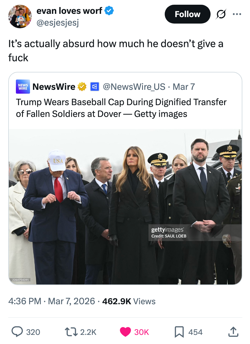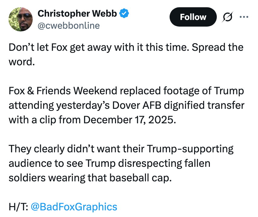 I'm the AAPI Culture Editor here at BuzzFeed, where I cover everything from trending news to pop culture to AAPI issues. Take your hat off, you disgusting little man. https://t.co/9CLllVr2nI Note: The image in the original tweet was replaced here due to photo rights. Wow -- as first spotted by @BadFoxGraphics, Fox & Friends this morning used *old footage of a previous dignified transfer* to mislead their audience about the fact that Trump wore a baseball cap during the one yesterday pic.twitter.com/5Xn3Q6ksx5 According to AP News, Fox released an additional statement: "We regret the error and apologize for the incorrect footage."