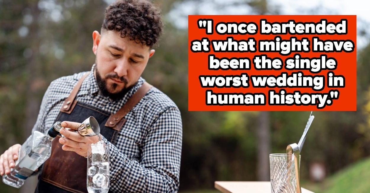 "Someone yelled for paper towels that were absolutely not going to help." I’m an award-winning writer and editor living in New York City, where I currently work at BuzzFeed as the Senior Lifestyle Editor. "I saw that once when I was young. Her response was 'You son of a bitch' and she walked out. Turned out they were already engaged, and he did it to upstage his cousin. The relationship ended by the next week." "To me, this is a key sign for how (un)successful the marriage is going to be. Shoving cake into someone's face is a sign of disdain, disrespect, and is just hateful." "The venue itself was a gorgeous 5,000-square-foot barn with bathrooms built into the framed walls. Everything was pine wood, beautifully finished. I’m behind the bar, watching the crowd, and about an hour in, I start noticing people acting really strange. Not drunk, strange. More like… something is very wrong with their internal organs, strange. People were sweating, pacing, disappearing toward the bathroom. Then I noticed water seeping out from under the bathroom wall. At first, I thought a pipe burst, but the water kept coming. Turns out, the venue had low-flow, water-saving toilets, and people were simultaneously vomiting and experiencing other catastrophic digestive events faster than those toilets could flush. So, the toilets clogged, overflowed, and filled the floor drains. The 'liquid' started spreading across the barn floor. Now, combine that smell with the August heat, and suddenly, a new thing happened: Everyone who smelled it started vomiting, too... Like a domino effect. Guests were slipping around. People were gagging. Someone yelled for paper towels that were absolutely not going to help. At this point, we realized this wasn't alcohol; this was food poisoning. So we go check the buffet. The seafood rice had been sitting out all afternoon after a two-hour car ride in the heat. When we lifted the lid, the smell of ammonia was so strong, it nearly knocked us over. That tray had basically become a biological weapon. Most of the adults had eaten it, which explained why all the adults were violently ill. Meanwhile, the children who refused to eat seafood rice were perfectly fine. So while the adults were fighting for their lives in the bathroom apocalypse, the kids had essentially become feral: Some were writing on the interior pine walls of the barn. Others were throwing clothing into the decorative water feature. One group had apparently started small fires outside. An absolute Lord of the Flies situation. At this point, the venue owners pulled me aside and said, 'Flip the breaker.' So we shut off the power to the whole barn. Lights out. Music dies. Total chaos. Then I made the announcement: 'Ladies and gentlemen, the venue is now closed.' Three ambulances showed up. Guests were being hauled out. The bride’s ride home got sick, so she ended up driving herself home in her wedding dress. On the way home, she got pulled over and arrested for a DUI, which, unfortunately, was her third DUI, turning it into a felony. Now, she was legally unable to leave the country — and their elaborate two-week honeymoon in Dubai? Canceled. So, to recap: Food poisoning. Bathroom flood. Vomiting chain reaction. Ambulances. Children committing minor arson. Power shutdown. The bride was arrested in her wedding dress. And that… is the worst wedding I have ever witnessed." "She was supposed to take them at the end of the night. She had a large van to do just that, but instead, we had to take them up the elevator because we couldn’t leave them out overnight. Some of the floral arrangements were extremely large and heavy, and it took two of us to lift just one of the damned things. Oh, and the bride also damaged the bar by climbing on top of it to dance in her high heels. It was scratched and gouged. I wonder if she’s still married to that guy because she seemed like a real piece of work."