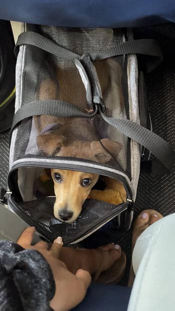 We hope you love our recommendations! While every product is independently chosen by our editors, BuzzFeed and our publishing partners may collect a share of sales or other compensation from the links on this page. You can read more about how our affiliate partnerships work in our Editorial Standards & Ethics Guide. Time to make traveling with your canine bestie as easy and comfortable (for *both* of you!) as possible. Traveling with your pup can sound fun, until it comes to the daunting task of choosing the right travel carrier for them. There are several boxes it should check, including being the right size, being able to withstand the rigors of travel, and making them feel safe and cozy (just to name a few!). As a dog momma myself, I'm always looking for pet travel products that'll make life easier for both of us. From sling carriers for the smaller pups to more safety-centered kennels for large dogs, I've curated a list of carriers that'll make traveling with your furry pal feel like the safe, stress free, *pawsitive* experience it should be — from the road to the sky and back home. Say hello to the crowd-pleaser of all dog carriers. It features mesh panels for ventilation, escape-proof locking zippers, top and side entries for easy loading, a waterproof interior base, a padded, detachable carrying strap, and a removable, machine-washable base liner. And! This baby's equipped with a patented spring wire frame that allows the rear end of the carrier to be pushed down several inches to easily fit under airplane seats in compliance with most major airline requirements. Reviewers say it leaves their pet plenty of room to move around, and one reviewer even mentioned their dog *chose* to sleep in there the entire night. Promising review: "Leading up to my Southwest flight, I was very nervous traveling with my four-month-old Goldendoodle. Thankfully, the bag worked out great! My Doodle weighs about 12 pounds, is 14 inches long, and is 11 inches tall. He was able to lie down in the bag and stand up with the zipper open when we were at the gate. We had an eight-hour journey with two-hour layovers both ways. My Doodle stayed calm in the bag 98% of the time with the help of some treats. I cannot recommend this bag enough. One pro tip that helped me the week leading up to the flight, I had my Doodle get into the bag for 15–20 minutes at a time and gave him treats so he was used to it once we got to the airport. I am very grateful to have had this bag for the trip." —Greg Reck Get it from Amazon for $42+ (available in three sizes). Shopping for a carrier on a budget doesn't have to mean sacrificing the most important factors of comfort and convenience, and this carrier proves it. It's designed with a four-sided mesh that not only makes it comfier and breathable for your pet, but also easy for you to check on them (and to ensure they can see you if they've got any separation anxiety!). It's also got two connecting loop handles for balanced carrying as a dual seat belt or luggage strap *and* has a super soft padded bottom. Who would've thought such an affordable carrier could give your pup such a tail-wagging experience? Promising review: "Love this! It is the perfect size for my 6-month-old pet. She loves it just as much and has gone inside to lie in it, which was so cute. The zippers work great! It’s roomy, no weird smell, definitely worth the money for sure! I love how you can open it up three ways! And, not only did they send this carrier, but they also added pet grooming wipes, which is awesome! I highly recommend this bag! I can easily store it in my closet until further use is needed! I can’t wait to take her to her vet appointment so she can get more use out of it. I purchased the bigger version of this so that she can grow into it and I won’t have to buy a bigger one later." —Shauna Wixson Get it from Amazon for $22.48+ (available in two sizes and six colors). The teacup-sized puppers are going to love this one! While airlines typically require a carrier with a more hard-sided construction, this is still great for using *at* your destination or long walks or train rides. Reviewers appreciate it for its thick, soft material and love that it gives their dog a large opening while still having a secure snap closure. It's also got an adjustable strap buckle, a big zipper pocket, and a safety back buckle. Sling carriers are also great for giving your pup the secure feeling of being carried by you without *actually* being carried by you. Promising review: "This is a great sling. I recently adopted a 6-pound chihuahua, and she’s fearful of people. This sling allows me to bring her out while still giving her a safe space. It’s been very helpful as we begin teaching her that people can actually be very nice. I ordered the medium so that she’d have some space, and I really think it’s the perfect size for her. I really like that it has snaps on the opening so that once she’s in, I can secure her, so only her head peeks out. The hook is a great feature as well, although we don’t need it. The thick strap is helpful on our walks, as even little dogs can get heavy, and the support is needed. I like that it’s so easy to adjust as well. My dog seems very happy and comfortable in it. Even though she’s fearful, she was happy in this sling right away. The lining is thin, so on cold days, I add a small blanket. Great quality, comfortable, easy to use, and my dog is happy. A+ from us!" —Heather Svoboda Get it from Amazon for $27.99+ (available in five sizes and eight colors). Pets that are too large to fly in the cabin of the airplane also deserve the safest, most comfortable experience possible. That's where this crate comes in! According to the brand, this kennel is the only double-walled crate on the market constructed with rotational molding. What does this mean? It means an exterior layer works to absorb the majority of an initial impact, and an interior wall provides another