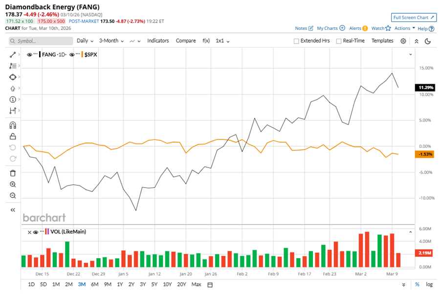 Diamondback Energy, Inc. (FANG), headquartered in Midland, Texas, operates as an independent oil and natural gas company. With a market cap of $51.6 billion, the company acquires, develops, explores, and exploits unconventional, onshore oil and natural gas reserves in the Permian Basin in West Texas. Companies worth $10 billion or more are generally described as “large-cap stocks,” and FANG perfectly fits that description, with its market cap exceeding this mark, underscoring its size, influence, and dominance within the oil & gas E&P industry. FANG's competitive edge stems from its high-quality acreage, technological innovation, and strong balance sheet, driving growth and resilience. Its efficient operations and cost management enable robust free cash flow, even in volatile commodity markets. Focused on the Permian Basin, Diamondback prioritizes operational excellence and strategic growth to deliver long-term value. 2 Energy Stocks to Watch as Strait of Hormuz Risk Spikes Oil Volatility Strait Talk: How To Play Oil Volatility Right Now as the Strait of Hormuz Shakes Stocks Nat-Gas Prices Fall on Hopes for Near-Term End to the War in Iran Get exclusive insights with the FREE Barchart Brief newsletter. Subscribe now for quick, incisive midday market analysis you won't find anywhere else. Despite its notable strength, FANG slipped 4.4% from its 52-week high of $186.65, achieved on Mar. 9. Over the past three months, FANG stock gained 11.3%, outperforming the S&P 500 Index’s ($SPX) 1.5% decline during the same time frame. Shares of FANG rose 18.7% on a YTD basis and climbed 26.9% over the past 52 weeks, outperforming SPX’s YTD marginal losses and 20.8% returns over the last year. To confirm the bullish trend, FANG has been trading above its 50-day and 200 moving averages since early November, 2025, with slight fluctuations. On Feb. 23, FANG shares closed down more than 1% after reporting its Q4 results. Its adjusted EPS of $1.74 did not meet Wall Street expectations of $1.88. The company’s revenue was $3.4 billion, surpassing Wall Street forecasts of $3.2 billion. FANG’s rival, Occidental Petroleum Corporation (OXY) has taken the lead over the stock with its shares rallying 29.2% on a YTD basis, but lagged behind the stock with 12.2% gains over the past 52 weeks. Wall Street analysts are bullish on FANG’s prospects. The stock has a consensus “Strong Buy” rating from the 32 analysts covering it, and the mean price target of $185.79 suggests a potential upside of 4.2% from current price levels. On the date of publication, Neha Panjwani did not have (either directly or indirectly) positions in any of the securities mentioned in this article. All information and data in this article is solely for informational purposes. This article was originally published on Barchart.com