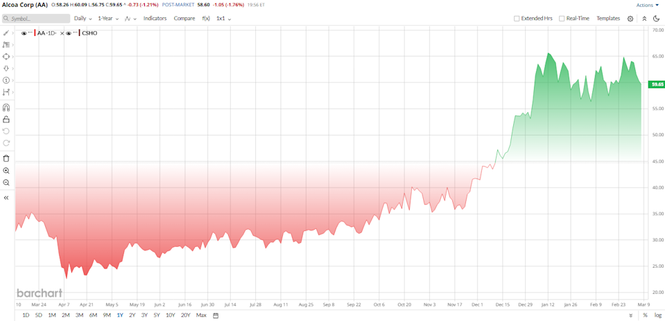 Aluminum has quietly become one of the more geopolitically sensitive industrial commodities. When shipping lanes are in danger, prices and regional premiums can sprint higher. Traders are already paying higher prices for metals, as concerns about Middle East supply-chain disruptions shift the risk calculus for global manufacturers.That dynamic helps explain why Alcoa (AA) and Century Aluminum (CENX) are drawing fresh investor attention. Both names sit squarely in the path of any rally triggered by tighter seaborne flows. Fears that the Strait of Hormuz could see continued disruptions, after reported incidents near facilities run by Emirates Global Aluminium and Aluminium Bahrain, helped push aluminum futures higher on the London Metal Exchange. News outlets such as Bloomberg and analyst notes from Citi warn that regional disruptions could reshuffle flows, a setup that could create a buying opportunity in AA and CENX for risk-tolerant investors. Crude Prices Rally Despite IEA Stockpile Release Nat-Gas Prices Rally as Iran War Drags On Crude Prices Rally Despite IEA Stockpile Release Stop Missing Market Moves: Get the FREE Barchart Brief – your midday dose of stock movers, trending sectors, and actionable trade ideas, delivered right to your inbox. Sign Up Now! Alcoa is a major U.S. aluminum producer. Rising U.S.-Iran tensions have threatened the Strait of Hormuz shipping lane, prompting a surge in aluminum futures. If Middle Eastern output is disrupted, higher metal prices could potentially benefit Alcoa’s shares. Valued at a market cap of about $16 billion, AA’s stock has rallied strongly, trading in the mid-to-low-$60s versus the low-$20s a year ago on booming aluminum prices and U.S. regional premiums. The Iran war and higher tariffs have driven much of this rally, pushing the stock up roughly 97% over the past year. For income-focused investors, Alcoa currently offers a forward dividend yield of about 0.67%, paying $0.10 per share quarterly, with a low 10.6% payout ratio that suggests the company prioritizes reinvesting cash into growth and defense technology. On the valuation side, Barchart data said Alcoa’s forward price-to-earnings (P/E) is about 11.4x, well below the sector median of 25x, indicating a relatively cheap valuation. However, the price-to-book ratio of 2.5x is just slightly below the sector median of 2.6x. Analysts warn the stock looks “expensive” given its growth outlook, implying only limited upside without continued price support. Operational performance has also supported investor interest. In Q4 2025, Alcoa posted $3.45 billion in revenue, up 15% sequentially. GAAP net income was $226 million, and adjusted net income came to $1.26 per share, well above estimates. Stronger realized aluminum prices lifted the aluminum segment sales by 21%, more than offsetting higher U.S. tariffs. Plus, the company generated about $537 million in operating cash, versus $66 million in Q3. It ended Q4 with $1.6 billion in cash. Notably, Alcoa set production records at several smelters and closed strategic deals, such as selling its Saudi JV stake, during the quarter. Beyond the numbers, Alcoa is making investments in its operations. In late 2025, it secured a 10-year power contract with New York’s grid operator and announced a $60 million upgrade to its smelter in Massena, New York. This deal delivers 240 MW of cheap renewable energy and a modernized anode furnace, which should lower Alcoa’s future energy costs and support higher output. Looking ahead, Analysts expect Alcoa’s next quarter (Q1) to show roughly flat revenue and modest earnings per share (EPS) growth, assuming current metal prices hold. Seasonal factors and the ramp-up of new projects imply only moderate growth. Consensus calls for breakeven sales and slightly higher margins year-over-year. Barchart’s consensus rating on AA is “Moderate Buy.” The average 12-month price target is about $60.18, which implies limited upside. From my perspective, Alcoa is viewed as an opportunity as it offers a hedge on supply disruptions, but the valuation leaves little margin without a fresh spike in metal prices. Century Aluminum operates several U.S. smelters. The same supply concerns that have driven aluminum prices higher are bullish for Century. For example, aluminum futures recently jumped 1.7% to multi-month highs on March 2, as the Iran conflict threatened exports through the Strait of Hormuz. Just like Alcoa, CENX stock has enjoyed a historic rally. It’s trading just slightly below $54, up from $13 a year ago, and it is currently up more than 220% over the past year, driven by surging aluminum prices and higher U.S. premiums amid tight supply. That sharp rise is also supported by the improved profitability of aluminum producers over the last year. Despite the strong rally, valuation metrics still appear relatively favorable. Century’s valuation remains attractive after the rally. CENX’s forward P/E is only 7.9x as of now, far below the industry median of 13.9x. In other words, the stock is trading on depressed current earnings, implying room for upside if profits rebound. In Q4 2025, Century generated $633.7 million in sales and net income of just $1.8 million, or $0.02 per share, which was a sharp sequential improvement. Shipments fell 14% due to an Iceland smelter outage, yet higher aluminum prices and premiums kept revenue roughly flat. The company ended the quarter with $134 million in cash and $418 million in total liquidity, leaving a strong financial base for expansion. Century is also expanding capacity as part of its longer-term strategy. In January 2026, it announced a JV with Emirates Global Aluminium to build a new U.S. smelter in Oklahoma, the first greenfield project since 1980. It also agreed to sell its idled smelter in Hawesville, Kentucky, and restart 50,000 metric tons at its Mt. Holly, South Carolina, plant by mid-2026. These moves significantly boost long-term output. Looking forw