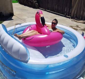 Promising review: "I have had this pool for about two weeks now and I LOVE IT!!! Was simple to set up, I got a little electric pump. and it took about 10 minutes to inflate, then about half an hour to fill with water. Pay attention to make sure you set it up on level ground or it will be lopsided. I live in South Carolina, so it is already hot and humid, and I use it about every afternoon. It is probably good for two adults, maybe one adult and a couple of kids. The built-in seat and headrest are really quite comfy and relaxing. I will definitely buy this same pool again if it springs a leak and can't be fixed, if I could give it 10 stars, I would. LOVE, LOVE, LOVE it!!!" —Kathryn J.