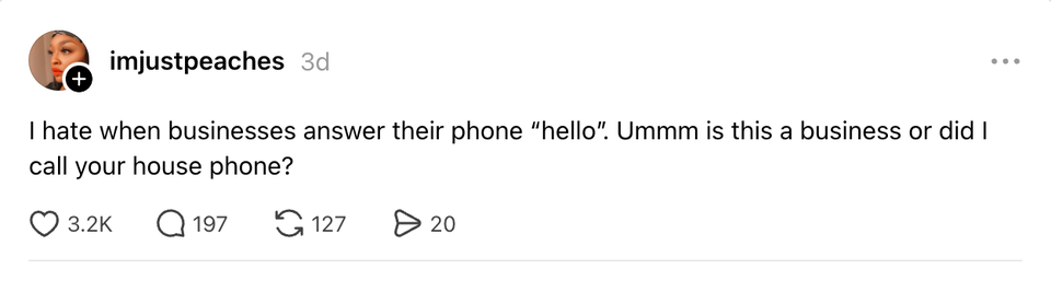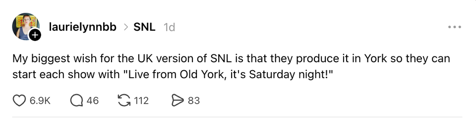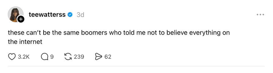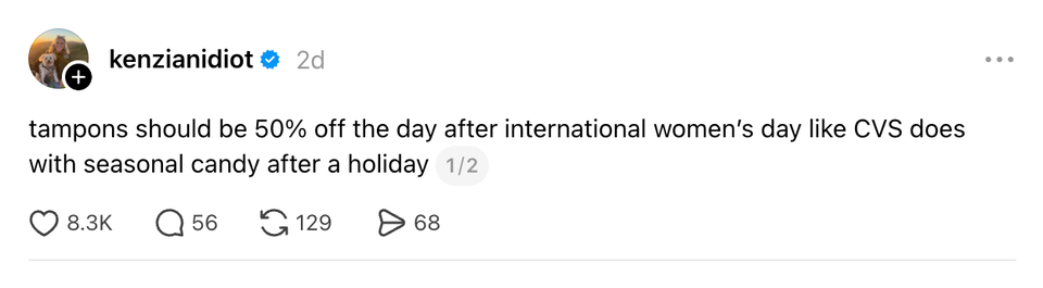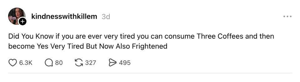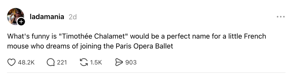 The ladies of the internet never fail to brighten our day with their brilliant and succinct wit. Each week, HuffPost Women rounds up their hilarious musings. Scroll through this week’s great tweets, threads and other posts from women, and then visit our “Funniest Tweets From Women” page for past roundups. Sign up for our Funniest Tweets of the Week newsletter here. The problem with ripping a tag out of cheap leggings is that sometimes that’s a load-bearing tag i love soup with a little bread. i would've been the best peasant accidentally used a frozen card for my uber eats order and even though it declined they still processed it because i’m a “valued eater” pic.twitter.com/hhDX1RYXl2 “Please show up 15 minutes early for your appointment” best I can do is 3 minutes late what if i hugged u really tight & then gradually loosened my grip & told u ur blood pressure is 130/95 I found a bra in his suitcase and he said it’s from when he was f@t years back. He said he had saggy titt!ěs and kept it to remind him how far he’s come with his weight loss journey. https://t.co/43JAH44VqU I love that people from Massachusetts created the most generous, socialist health care system in all 50 states while also being the most aggressive drivers. They’re like “I want my neighbors to have the best care. They’re gonna need it if they don’t get out of the left lane.” per my last crash out “Oil is $100 the barrel” what kind of 1600s ass measurement is that. That means nothing to me. Let me see the barrel love how every airport’s tsa is just doing their own thing and if you don’t know their rules you’re that city’s newly appointed jester So my trainer suggested I could boost the impact of power walks by wearing a weighted vest so I googled what they look like and uhhhhhhhh is she serious right now. There are two primary types of Catholics: -spiritually Irish-spiritually ItalianAll other Catholics, based on culture and personal temperament, are closer to one or the other side of this spectrum. when meryl streep gets an oscar for playing donna kelce is the film about her renovations- I know things feel overwhelming right now, so this is your sign that it’s okay to take a step back from the news. Every one of us is struggling to process Timothee Chalamet’s opera comments and Donna Kelce’s home renovation. Take a break and put yourself first ❤️ italy proving kissing and having silly little drinks with the homies is the key to success just saw a kid walking with a balloon. that’s so classic Someone asked me if I'd watch their pets after the rapture takes them. Not gonna lie, that was a sick burn and compliment at the same time. By entering your email and clicking Sign Up, you're agreeing to let us send you customized marketing messages about us and our advertising partners. You are also agreeing to our Terms of Service and Privacy Policy.