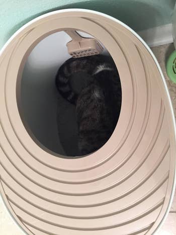 Promising review: "We have three cats and have to manage a silly amount of cat politics. We've learned that having a higher number of litter boxes, and spread to different locations, cuts way down on bullying and helps cats to feel safe, [as they are] instinctively territorial about where they put their scent and feel vulnerable when they're 'in the act'. This cat box helps to be able to have boxes in rooms of the house where a cat box would feel garish, not to mention the litter mess. It took a little while for my cats to try it out but they're using it now and don't get to kick the gravel out everywhere (I swear they do it on purpose)." —Dism