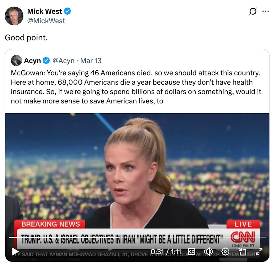 CNN / @Acyn / Via Twitter: @Acyn Related: Everything Seems Awful Right Now, So Here Are 19 Internet Posts From This Week That Might Actually Restore Your Faith In Humanity According to a study done by the Atlanta Journal-Constitution, "As many as 44,789 Americans of working age die each year because they lack health insurance." Related: My Lungs Are Physically Sore From Laughing So Hard At These Hilarious Black Twitter Tweets From The Week Related: These 46 Funny Tweets From The Week Have Me Genuinely Howling Like My Dog After Hearing A Squeaky Toy, And Trust Me, I Don't Laugh At Just Anything Related: 23 Examples Of Adults Who Have Absolutely No Frickin' Clue What They Are Doing, Like We Should Be So, So, So Worried You Might Like: I Bet You Can’t Scroll Through This List Of Amazon’s "Most Wished For" Products Without Feeling A Twinge Of FOMO You Might Like: 34 Things That'll Make Your Future Self Say "Thank Goodness I Bought These In March" Also in Internet Finds: People Are Confessing The "Horrifyingly Cringy" Experiences They Wish They Could Erase From Their Memories, And Whew, I'm Getting Secondhand Embarrassment Reading These Read it on BuzzFeed.com