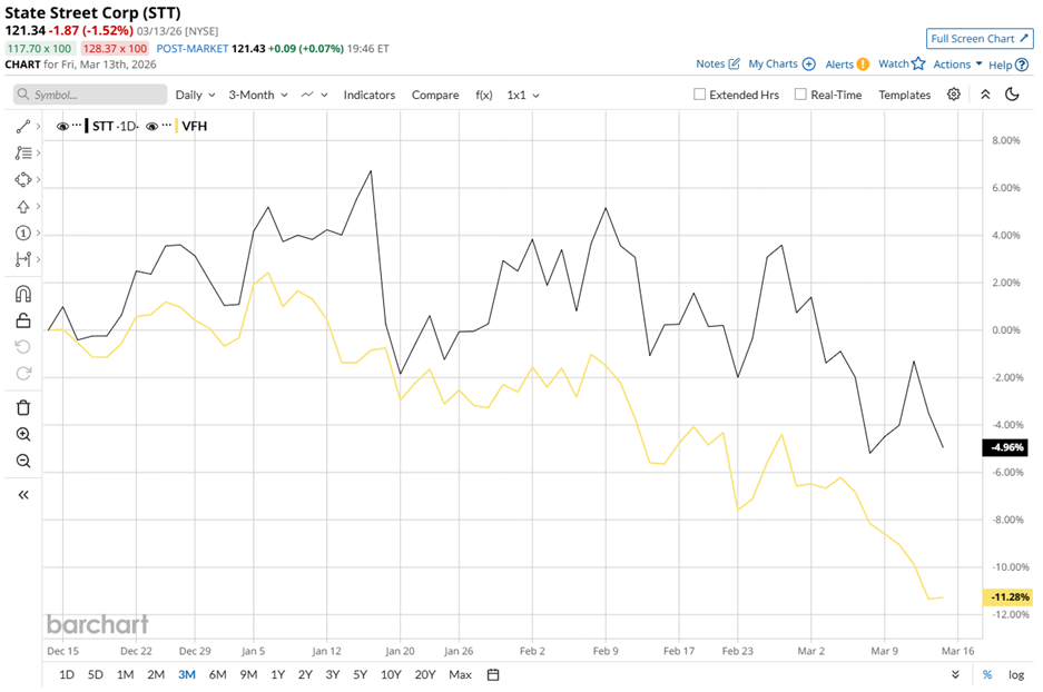 The longer lens tells a more compelling story. During the past 52 weeks, STT stock surged 43.7%, while VFH advanced just 4.5%. The performance gap highlights how strongly investors rewarded the company’s operational stability and strategic positioning. Even in 2026, the divergence remains visible. Year-to-date (YTD), State Street’s shares have fallen roughly 6%, yet the financial ETF dropped a deeper 10.7%.