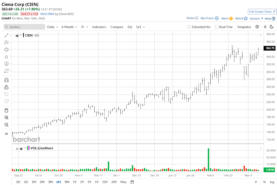 Ciena Corporation (CIEN) is a premier American networking systems and software provider that serves as a vital architect of the world’s high-capacity digital infrastructure. The company specializes in optical and packet networking, enabling service providers and hyperscale cloud giants to transmit massive amounts of data at lightning speeds. Its industry-leading WaveLogic technology powers roughly 85% of the world’s largest service providers, making it a cornerstone of the modern internet and the burgeoning AI era. Based in Hanover, Maryland, and founded in 1992, Ciena is a global enterprise with over 9,000 employees and a presence in more than 35 countries. What Options Traders Expect from Micron Stock After Earnings on March 18 Stocks Set to Open Higher as Bond Yields Fall, Fed Meeting and Middle East Conflict in Focus This Dividend King With a 54-Year Dividend Streak Is Down 13% YTD. Time to Buy the Dip? Stop Missing Market Moves: Get the FREE Barchart Brief – your midday dose of stock movers, trending sectors, and actionable trade ideas, delivered right to your inbox. Sign Up Now! Ciena has experienced a monumental surge over the past year, reflecting its critical role in the AI networking super-cycle. As of March, CIEN stock has a staggering 467% gain over the last 52 weeks. While the stock saw significant volatility following its March 5 earnings report, initially slipping 12% due to conservative guidance, it quickly rebounded with a 14% gain over the last five days. Compared to the broader S&P 500 Information Technology Index ($SRIT), Ciena has significantly outperformed, driven by a record $7 billion backlog and its inclusion in major indices like the Bloomberg 500. For the first quarter of fiscal 2026, Ciena delivered a blockbuster performance, reporting record revenue of $1.43 billion, a 33% year-over-year (YoY) increase that comfortably beat market expectations. The company achieved an adjusted EPS of $1.35, more than doubling the $0.64 reported in the same period last year and significantly surpassing the $1.17 analyst consensus. This growth was supercharged by the Optical Networking segment, which grew over 40% as cloud providers and hyperscalers scrambled to upgrade data center interconnects for AI workloads. Ciena's financial discipline was evident in its 17.9% adjusted operating margin, which expanded from 12.3% a year ago. The company ended the quarter with a robust $1.4 billion cash balance and generated $228 million in operating cash flow. Looking ahead, management raised its fiscal year 2026 revenue guidance to between $5.9 billion and $6.3 billion, signaling 28% growth at the midpoint. CEO Gary Smith noted that demand for the company’s 1.6T WaveLogic 6 solutions is "unprecedented," with a record order book that ensures durable momentum through 2027 despite ongoing global supply chain constraints. TD Cowen has named Ciena a "Top Pick" with a “Buy” rating, identifying the company as a critical player in the global AI infrastructure boom. Analysts believe Ciena is uniquely positioned to benefit from the massive expansion of data centers, specifically through its leadership in Datacenter Interconnect (DCI), the technology that links massive data facilities together to handle intense AI workloads. A key factor in this bullish outlook is Ciena's technological edge. While traditionally known for serving telecom providers, Ciena has successfully shifted toward "hyperscalers" like Google and Microsoft, with cloud-related revenue now making up 32% of its business. The brokerage also highlighted Ciena’s recent Nubis acquisition, which allows the company to provide connectivity inside data centers, not just between them. Despite the stock trading at a higher price than usual, TD Cowen argues that Ciena's "clean" growth story and lack of major obstacles make it one of the most durable investments in the AI networking space. Ciena presents a compelling case as a high-performance alternative to the more crowded chipmaker trades. While its current mean price target of $332.19 suggests an 8.5% technical downside, this figure often lags the rapid fundamental shifts occurring in the optical networking sector. With 10 "Strong Buy" ratings and its new status as a "Top Pick" at TD Cowen, the bullish argument hinges on Ciena's "clean" exposure to the AI super-cycle. For investors who believe that the massive build-out of data centers will continue to drive unprecedented demand for high-speed fiber connectivity, Ciena offers a durable, research-driven way to play the AI revolution without the priced-for-perfection risk associated with major semiconductor giants. On the date of publication, Ruchi Gupta did not have (either directly or indirectly) positions in any of the securities mentioned in this article. All information and data in this article is solely for informational purposes. This article was originally published on Barchart.com