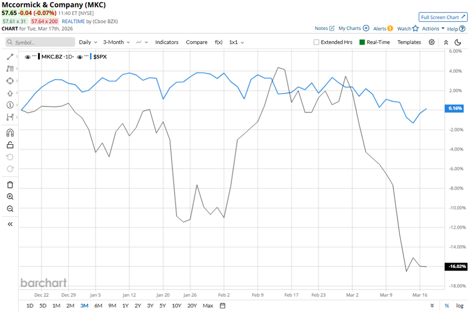 Shares of the Hunt Valley, Maryland-based company have fallen 30.7% from its 52-week high of $83.15. MKC stock has declined 16% over the past three months, underperforming the broader S&P 500 Index’s ($SPX) marginal gain over the same time frame.