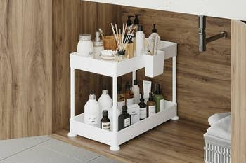 Promising review: “Top notch and durable. Excellent quality, fair price. Doubled the space in my bathroom cabinet! Extra bonus… no assembly needed!! Brought it home, placed it in the cabinet, filled the slide-out drawer. Placed a clear tote on the top ‘shelf.’ Now it's so easy to see my stored items, and it looks neat and tidy. It transformed my space!” —rebecca