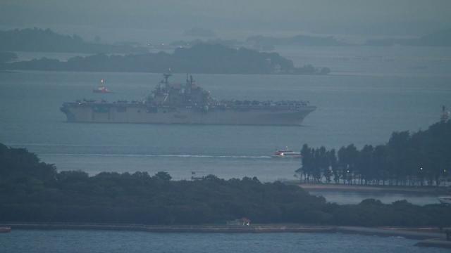 The amphibious assault ship USS Tripoli was approaching Singapore, at the southwestern edge of the South China Sea, Tuesday morning, according to AIS tracking data seen by CNN.