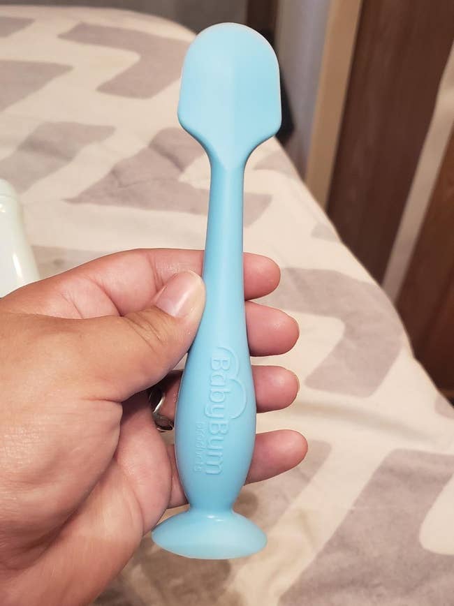 "I bought this because my daughter has super sensitive skin and is prone to diaper rashes. Because of this, I use Aquaphor for every diaper change, and this little butt spatula takes the hassle out of messy finger application. I'm such a big fan of this thing. Helps spread creams evenly and easily. The silicone material is easy to clean. It is a durable and quality product, it is at a good price, and it has a little suction cup to keep it upright. If you frequently use diaper rash creams, I would HIGHLY recommend this applicator to make the process easier and less messy!" —Lyla Mae