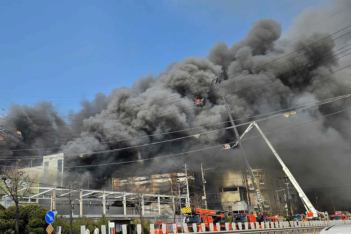 Photos from the scene show huge plumes of thick black smoke billowing from the three-story factory. The fire was reported shortly before 1:30 p.m. local time on March 20.