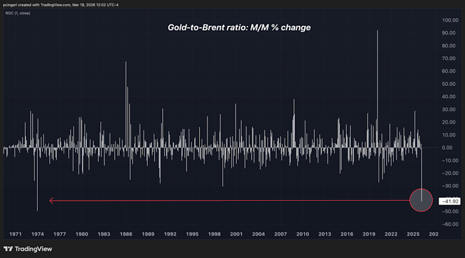 A movement unseen since the Arab oil embargo is reshaping commodity markets — and the longer the Iran war and the Hormuz blockade hold, the deeper the damage runs. Gold prices are facing their worst monthly performance against Brent crude since December 1973 — and the shockwave is tearing through the mining sector with historic force. Gold, tracked by the SPDR Gold Shares, is down 13% month-to-date, falling to $4,580 per ounce as of Thursday morning — its worst absolute monthly drop since October 2008, when Lehman Brothers had just collapsed and global markets were in freefall. But the absolute decline in gold is almost a distraction from what is happening in relative terms compared to oil prices. The gold-to-Brent ratio — the number of barrels of crude an ounce of gold can buy — has crashed 43% month-to-date to roughly 40. Don't Miss: Investors With $1M+ Often Use Advisors for Tax Strategy — This Tool Matches You With One in Minutes Think your retirement plan is on track? Click here to see how it stacks up against the numbers most Americans are missing That is gold’s worst monthly performance against oil since December 1973, when Arab states cut off crude exports to the West and rewired the entire global commodity order. The conventional market wisdom holds that gold rises in times of geopolitical stress. Safe-haven demand, the argument goes, pushes bullion higher when uncertainty spikes. The Iran war has turned that playbook on its head. Gold is not a simple safe-haven asset that rises in any conflict. Gold is an interest-rate-sensitive asset, and right now, interest rates are the problem. Rising oil prices, driven by the Strait of Hormuz disruption and the broader energy shock, are reigniting inflationary fears that markets had spent months assuming were behind them. Before the conflict, traders had priced in two Federal Reserve interest rate cuts in 2026. That expectation has now evaporated. In its place, a more alarming scenario is gaining traction: if the energy shock persists, the risk of outright rate hikes re-enters the picture. Trending: You Saved for Retirement — But Do You Know What You'll Keep After Taxes? According to Polymarket, there is a 17% chance of a Fed rate hike this year – that’s more than double the odds seen prior to the start of the war in Iran. This is the mirror image of the 2025 historic gold rally. Then, falling inflation and aggressive rate-cut expectations propelled gold to record territory. Now, the same mechanism is working in reverse. The VanEck Gold Miners ETF — as tracked by the VanEck Gold Miners ETF — has shed 29% of its value in 19 days, from a monthly high of $117 to $82 as of Thursday. The gold mining sector is now on track for the worst monthly collapse since the aftermath of the Lehman Brothers bankruptcy in October 2008. It would have seemed unthinkable just weeks ago, as miners were Wall Street’s hottest sector. The GDX ETF had surged nearly 200% between February 2025 and the close of February 2026, carried by the most powerful gold rally in nearly five decades. Gold itself returned 64.6% in 2025 — its best annual performance since 1979. By late January 2026, spot gold had reached an all-time high of $5,589 per ounce. The rally seemed unstoppable. Then the Iran war began and it crashed the entire bullish metal narrative. See Also: What If Tires Didn't Need Air — Or Replacing? This Startup Says It's Possible Gold mining companies earn profits from the difference between the gold price they sell it for and the cost of extracting it from the ground. When gold prices fall and energy costs surge simultaneously, that margin is attacked from both directions. Since the war in Iran began, wholesale diesel prices — the primary fuel for heavy mining equipment — have risen 61%. Energy typically accounts for 15%–20% of total cash costs at major gold mining operations. A 61% surge in diesel does not compress margins linearly — it can eliminate them entirely at higher-cost mines. The gold-to-oil ratio — a widely used proxy for mining sector profitability — illustrates the damage in stark terms. The last time the commodity market saw a dislocation of this magnitude was in the immediate aftermath of the Arab oil embargo — when a sudden, politically-imposed energy shock triggered a simultaneous surge in crude prices and a repricing of inflation expectations that proved devastating for non-yielding assets and energy-intensive industries alike. History, it seems, has an uncomfortable habit of rhyming. Read Next: Instead of buying someone else's ETF, build an index around your own thesis with Public's AI tools. Get started and see if you qualify for the 1% match. Photo: Shutterstock UNLOCKED: 5 NEW TRADES EVERY WEEK. Click now to get top trade ideas daily, plus unlimited access to cutting-edge tools and strategies to gain an edge in the markets. Get the latest stock analysis from Benzinga: APPLE (AAPL): Free Stock Analysis Report TESLA (TSLA): Free Stock Analysis Report This article Gold Eyes Worst Month Against Oil Since 1973; Mining Stocks Slump Most Since 2008 originally appeared on Benzinga.com