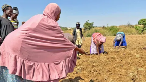 In a ploughed field, a group of villagers are planting seed potatoes.