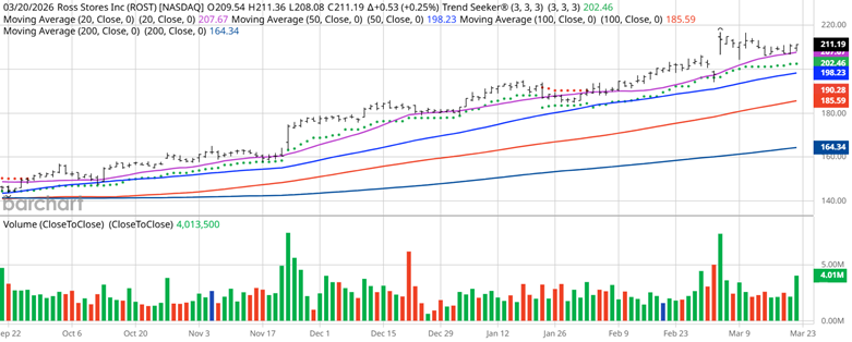 Ross Stores (ROST) has strong technical momentum. Shares maintain a 100% “Buy” technical opinion from Barchart. ROST is up more than 70% over the past 52 weeks. However, current momentum suggests the stock may be approaching a high point. Valued at $68.31 billion, Ross Stores (ROST) operates as an off-price retailer of apparel and home accessories, primarily in the United States. The company operates its stores under the Ross Dress for Less (Ross) and dd’s DISCOUNTS names. I found today’s Chart of the Day by using Barchart’s powerful screening functions to sort for stocks with the highest technical buy signals; superior current momentum in both strength and direction; and a Trend Seeker “buy” signal. I then used Barchart’s Flipcharts feature to review the charts for consistent price appreciation. ROST checks those boxes. Micron Technology Hikes Its Dividend 30% Due to Surging FCF - MU Is Worth 34% More - What's the Best Play? As Trump Admin Warns on Airport Closures, Should You Sell Delta Airlines Stock? Iran War, Oil Volatility and Other Key Things to Watch This Week Stop Missing Market Moves: Get the FREE Barchart Brief – your midday dose of stock movers, trending sectors, and actionable trade ideas, delivered right to your inbox. Sign Up Now! Editor’s Note: The technical indicators below are updated live during the session every 20 minutes and can therefore change each day as the market fluctuates. The indicator numbers shown below therefore may not match what you see live on the Barchart.com website when you read this report. These technical indicators form the Barchart Opinion on a particular stock. Ross Stores scored an all-time high of $216.80 on March 4. Ross has a Weighted Alpha of +75.30. ROST has a 100% “Buy” opinion from Barchart. The stock has gained 73.73% over the past 52 weeks. Ross has its Trend Seeker “Buy” signal intact. The stock recently traded at $213.97 with a 50-day moving average of $198.73. ROST has made 4 new highs and is up 6.31% over the past month. Relative Strength Index (RSI) is at 64.47. There’s a technical support level around $209.06. $68.31 billion market capitalization. 31.87x trailing price-earnings ratio. 0.83% dividend yield Revenue is expected to grow 7.24% this year and another 6.23% next year. Earnings are estimated to increase 10.71% this year and an additional 10.52% next year. The Wall Street analysts followed by Barchart gave the stock 14 “Strong Buy” and 4 “Hold” opinions with price targets between $200 and $248. Value Line rates the stock “Above Average” with price targets between $135 and $247. CFRA’s MarketScope rates the stock a “Hold.” Morningstar thinks the stock is 47% overvalued with a fair value of $148. 1,395 investors following the stock on Motley Fool think it will beat the market while 148 think it won’t. 31,180 investors are following the stock on Seeking Alpha. Short interest is 2.18% of the float with 3.19 days to cover the float. Analysts predict increases in both revenue and earnings for at least the next two years, but Morningstar thinks the price has gotten a little ahead of itself. Additional disclosure: The Barchart Chart of the Day highlights stocks that are experiencing exceptional current price appreciation. They are not intended to be buy recommendations as these stocks are extremely volatile and speculative. Should you decide to add one of these stocks to your investment portfolio it is highly suggested you follow a predetermined diversification and moving stop loss discipline that is consistent with your personal investment risk tolerance. On the date of publication, Jim Van Meerten did not have (either directly or indirectly) positions in any of the securities mentioned in this article. All information and data in this article is solely for informational purposes. This article was originally published on Barchart.com