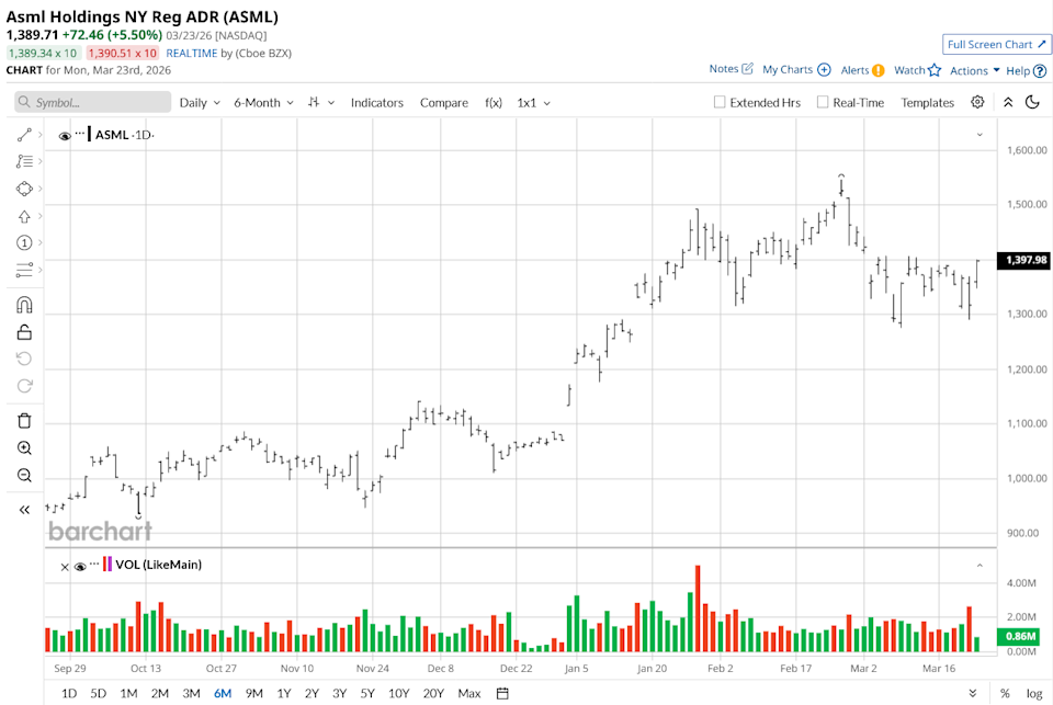 ASML Holding NY (ASML) is a Dutch multinational corporation and a foundational pillar of the global semiconductor industry. ASML is the world's sole provider of extreme ultraviolet (EUV) lithography machines, which are essential for etching the microscopic circuits found in the most advanced AI and high-performance chips. By utilizing complex laser-plasma light sources and precision optics, ASML enables chipmakers like TSMC (TSM), Intel (INTC), and Samsung to push the boundaries of Moore’s Law. Headquartered in Veldhoven, Netherlands, the company was founded in 1984. Micron Technology Hikes Its Dividend 30% Due to Surging FCF - MU Is Worth 34% More - What's the Best Play? As Trump Admin Warns on Airport Closures, Should You Sell Delta Airlines Stock? Iran War, Oil Volatility and Other Key Things to Watch This Week Stop Missing Market Moves: Get the FREE Barchart Brief – your midday dose of stock movers, trending sectors, and actionable trade ideas, delivered right to your inbox. Sign Up Now! ASML stock reflects a massive 94% surge over the past year. The stock has benefited from a significant re-rating as investor sentiment toward AI infrastructure remains robust. With a market capitalization exceeding $526 billion, ASML has recovered sharply from its 2024 lows, recently hitting a 52-week high of $1,547.22, despite a relatively minor 7% pullback in the last 30 days due to broader market consolidation. In comparison to the Nasdaq 100 ($IUXX), ASML has substantially outperformed the index over the last twelve months. While the Nasdaq 100 has seen strong gains driven by the broader "Magnificent Seven" rally, ASML’s specialized position in the semiconductor supply chain allowed it to nearly double the index's percentage returns. ASML concluded a record-breaking fiscal year 2025, reporting Q4 net sales of €9.7 billion, significantly exceeding market expectations. This performance contributed to a full-year revenue of €32.7 billion, a 16% increase compared to 2024. Net income for the quarter reached €2.8 billion, with a healthy gross margin of 52.2%. A standout metric was the record quarterly net bookings of €13.2 billion, of which €7.4 billion was specifically for EUV systems, resulting in a total order backlog of €38.8 billion by year-end. Looking ahead, management has issued a confident outlook for 2026, projecting total net sales between €34 billion and €39 billion. This growth is expected to be driven by a transition from 4-nanometer to 3-nanometer nodes among AI accelerator clients and a continued ramp-up of 2-nanometer production. To support this scaling, ASML announced a new €12 billion share buyback program through 2028 and increased its total 2025 dividend by 17% to €7.50 per share. Despite geopolitical export controls affecting certain shipments to China, the "notably positive" assessment from customers regarding AI-related demand suggests that ASML is entering 2026 with its strongest momentum in company history. TD Cowen analyst Krish Sankar maintains a "Buy" rating on ASML with a price target of €1,500 ($1,735), representing a valuation of 48 times projected 2027 earnings, and is about 25% higher than its current price level. This bullish outlook comes as ASML’s U.S.-listed shares have retreated 7% over the past month, creating what analysts describe as a "very attractive" entry point. The stock's premium over peers like Applied Materials (AMAT) and Lam Research has compressed from 120% in 2022 to just 20% today, largely due to a market rotation away from AI-exposed semiconductor stocks and concerns over lighter EUV tool usage. However, Sankar argues the market is underappreciating the necessity of EUV layers in future DRAM memory roadmaps and the inevitable adoption of High-NA machines. While some customers, like TSMC, have been publicly cautious about upgrading, improving reliability is expected to drive a shift toward newer 3800E and 4000F models. TD Cowen models a significant increase in system deliveries, reaching 68 tools by 2027. For long-term investors, this valuation "delta" provides a rare chance to acquire a monopolistic leader in chip-making machinery at a significant relative discount before the next phase of logic and memory scaling begins. ASML remains a cornerstone of the semiconductor industry, bolstered by a "Strong Buy" consensus from 28 analysts. With 21 "Strong Buy" and TWO "Moderate Buy" ratings, the professional sentiment is overwhelmingly positive. The mean price target of $1,570.56 suggests a significant 13% upside potential from current market levels, driven by the company’s monopoly on EUV lithography tools, which are essential for the AI revolution. On the date of publication, Ruchi Gupta did not have (either directly or indirectly) positions in any of the securities mentioned in this article. All information and data in this article is solely for informational purposes. This article was originally published on Barchart.com