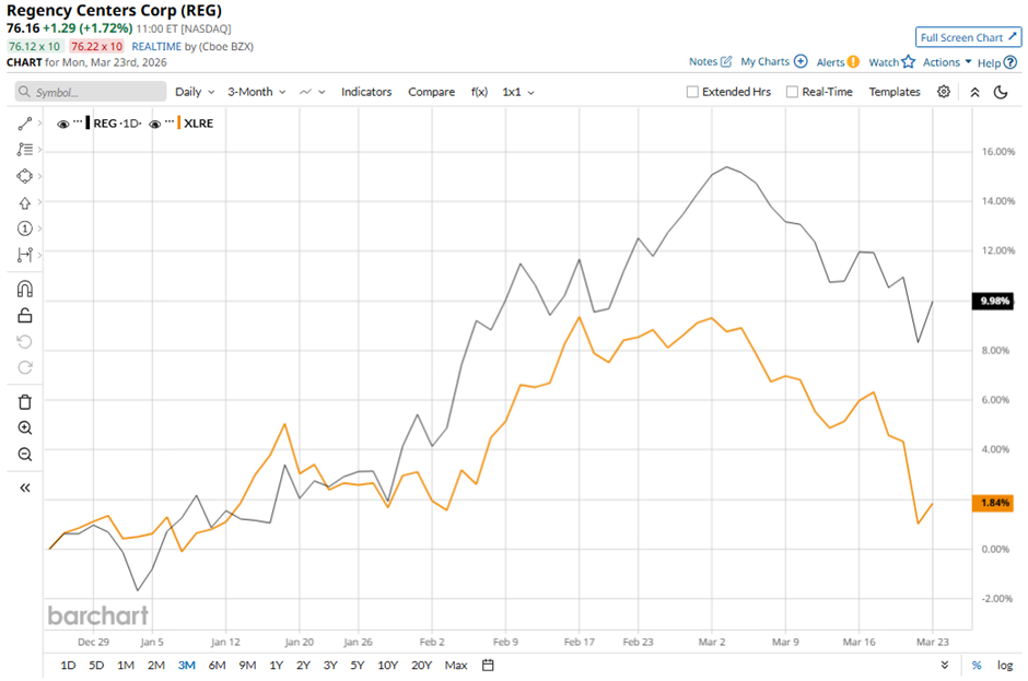 With a market cap of $13.7 billion, Regency Centers Corporation (REG) is a leading national owner, operator, and developer of shopping centers in suburban areas with strong demographics. Its portfolio features high-performing properties anchored by top grocers, restaurants, service providers, and premium retailers. Companies valued at $10 billion or more are generally considered "large-cap" stocks, and Regency Centers fits this criterion perfectly. The company focuses on creating vibrant centers that connect with local communities and customers. Micron Technology Hikes Its Dividend 30% Due to Surging FCF - MU Is Worth 34% More - What's the Best Play? As Trump Admin Warns on Airport Closures, Should You Sell Delta Airlines Stock? Iran War, Oil Volatility and Other Key Things to Watch This Week Stop Missing Market Moves: Get the FREE Barchart Brief – your midday dose of stock movers, trending sectors, and actionable trade ideas, delivered right to your inbox. Sign Up Now! Shares of the Jacksonville, Florida-based company have declined 4.7% from its 52-week high of $79.89. REG stock has risen 9.5% over the past three months, outpacing the State Street Real Estate Select Sector SPDR ETF's (XLRE) 1.7% rise over the same time frame. REG stock is up 9.7% on a YTD basis, outperforming XLRE’s 1.3% gain. Moreover, shares of the shopping center REIT have increased 5.9% over the past 52 weeks, compared to XLRE's 1.5% drop over the same time frame. The stock has been moving above its 50-day moving average since January. Shares of Regency Centers Corporation fell marginally following its Q4 2025 results on Feb. 5 as full-year NAREIT FFO came in at $4.64 per share, missing the consensus estimate. Investors were also cautious about mixed occupancy trends, with the same property leased rate at 96.5% (down 10 bps year-over-year) and anchor occupancy declining 70 bps, indicating some softness in key large-format tenants. In comparison, rival Simon Property Group, Inc. (SPG) has lagged behind Regency Centers stock on a YTD basis, with SPG stock rising marginally. However, SPG stock has risen 14.6% over the past 52 weeks, exceeding REG stock. Despite the stock’s outperformance on a YTD basis, analysts remain cautiously optimistic on REG. The stock has a consensus rating of “Moderate Buy” from 21 analysts in coverage, and the mean price target of $81.21 represents a premium of 6.6% to current levels. On the date of publication, Sohini Mondal did not have (either directly or indirectly) positions in any of the securities mentioned in this article. All information and data in this article is solely for informational purposes. This article was originally published on Barchart.com