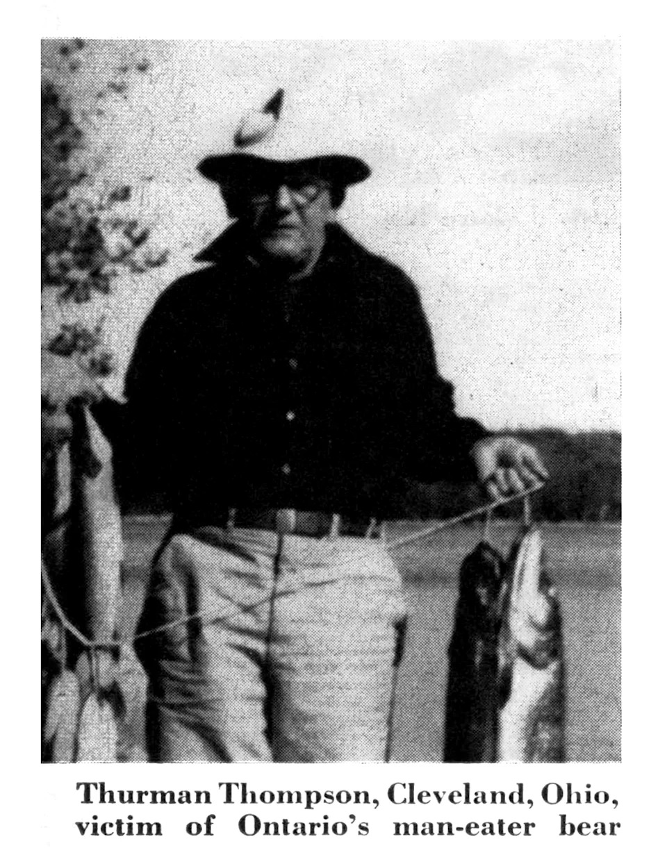 This story, “Black Bear Turns Man-Eater,” appeared in the June 1963 issue of Outdoor Life. It never entered my mind on that September day that I was seeing my friend Thurman Thompson alive for the last time. He had come into Biscotasing, a village on the Canadian Pacific Railway about 100 miles northwest of Sudbury, Ontario, from his cabin on Biscotasi Lake six miles or so to the south. Thompson was making a few last-minute purchases at the one general store before closing his place for the winter and returning to his home in Cleveland, Ohio. I met him on the store steps, and we chatted for a few minutes about his plans and his pending departure. Then the talk switched to bears. The berry crop had been almost a total failure that summer of 1961, and the bears had grown unusually bold in their search for food. Thompson had seen two or three around his place, and he remarked that they were showing less and less caution, coming close to the cabin to poke around for garbage. Wildlife photography was one of his hobbies, and he had hoped for years to get a chance to make some good close-up movies of a bear. “I’m taking more film back to camp with me,” he said. “I’ll have some real bear pictures to show you next summer.” “Don’t get too close,” I warned him. “They’re short of food and pretty hungry. You might run into one that’s looking for a fight.” The bear population in our part of Ontario had been building up to troublesome levels for years. More and more often they were breaking into hunting camps and cabins, smashing out windows, ransacking cupboards, and making off with anything edible. Even in hunting season, when the camps were occupied, they had several times broken in during daylight, while the hunters were out in the woods, to get at food supplies. And any moose left hanging within their reach overnight was almost sure to be worked on. Nobody expected any serious trouble, but I’ve lived in the woods most of my life and seen enough bear behavior to know that they are completely unpredictable. Wary and shy most of the time but now and then amazingly bold, they’re quick to shake their fear of man once they get used to him, clowning one minute and flying into a red rage the next. Nobody knows what to expect of them. I doubt even the bear himself knows. A hungry one is likely to be mean, and if he’s crowded or crossed, he can turn downright vicious quicker than you can tell it. It was with those things in mind that I urged Thompson to be careful. He nodded agreement, but I could see that he didn’t take my warning too seriously. “Any bear I’ve ever met,” he said with a chuckle, “was a lot more afraid of me than I was of him.” A few minutes later he walked down to the dock with his supplies, cranked up his 25-horsepower outboard, and waved goodbye. He swung away and headed down the lake, gathering speed. I hope he had no inkling of what was in store for him. I run two hunting and fishing camps in the roadless Ontario bush along the Canadian Pacific Railway northwest of Sudbury, one at Metagama, the other at Biscotasing, both whistle-stop villages. Thompson, an apartment-house manager in Shaker Heights, a suburb of Cleveland, had started coming to my Metagama camp several years before. He had a strong urge to get away from the city as often as he could, and delighted in fishing, camping, and living in the woods. Because of our location, in unspoiled country well away from any highway, the fishing for northern pike, walleyes, and trout is exceptionally good, and he found exactly what he was looking for. His wife Jo enjoyed the bush as much as he did. After a number of annual visits, the two of them decided to pick a spot on Biscotasi Lake and build a cabin of their own. They chose a secluded location on Descheney Bay about six miles from the village and equally far from the nearest neighbors, and put up a comfortable cabin, set among pines and birches, with a fine view and good fishing literally in their front yard. He knocked again and when there was still no answer he shouted a few times. Finally, he pushed the door open and looked in. By 1961, although he was only 62, Thurman had retired because of ill health, and he had spent most of that summer at the cabin. He and his wife had stayed three or four weeks and returned to Cleveland, and then he came back by himself for a six-week stay that would extend into the early fall. It was on Wednesday, September 27, that I saw him in the village. Moose season was due to open on Saturday, and I had a number of hunting parties coming in. By way of having everything ready, and also to avoid overloading the boats at the last minute, I make it a practice to send heavy supplies, such as food and gas, to my hunting camps back in the bush a day or so ahead of time. On Friday morning, one of my guides, Baldy St. Denis, left Biscotasing with a boatload of supplies for a party that would hunt on Indian Lake. Baldy had guided Thompson on several trips, and they had become good friends. With 10 miles still to go to his destination, he stopped in at Thompson’s place for the usual cup of coffee and a brief chat. No one answered his knock. The wooden shutters were nailed in place over the windows, ready for winter, but Thompson’s boat was tied at the dock, so the guide was sure he wasn’t far away. The door stood unlatched and partly ajar, and that puzzled St. Denis. He began to feel a vague sense of concern. He knocked again and when there was still no answer he shouted a few times. Finally, he pushed the door open and looked in. There was no sign of Thompson. The table was set but dishes hadn’t been used. The fire was out and the stove cold, with a half-cooked breakfast of bacon and eggs still on it. Sure now that something was wrong, Baldy went back into the yard to look around. A bright object on the ground a few feet from the cabin caught his eye. It was Thompson’s movie camera, smashed, with the film r