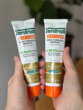 Promising review: "Amazing!!!!!! Actually game changer. I didn't think anything could help my fiance. Between all the gum, mints, floss picks, dentist visits with no problems found, I SAW THIS. It took like three weeks using this and even morning breath was so much more tolerable. I never thought I'd write a review for toothpaste but if you or your partner or kid have problems with seemingly no solution...switch it out. Tastes just like normal mint but is an absolute game changer. Don't let the three-week period turn you off, I promise it's worth it. You've survived without it, battle's almost over." —Shelby Minin