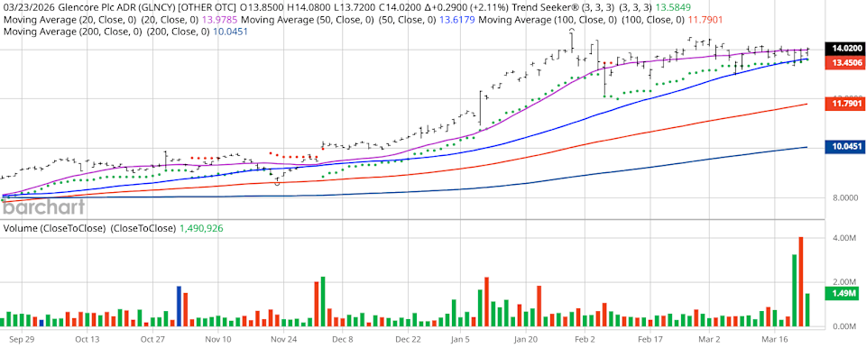 Glencore scored an all-time high of $14.67 in January 2026.