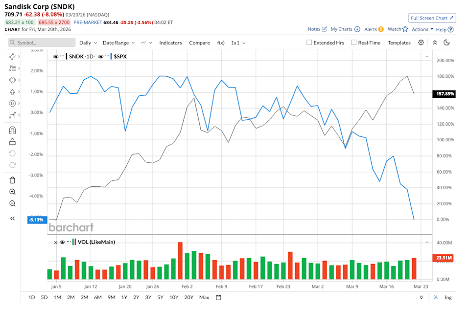 Nvidia (NVDA) remains one of the most sought-after stocks in the market today, dominating the artificial intelligence (AI) space with its powerful GPUs that train and run advanced AI models. But as AI systems grow more complex, the spotlight is moving beyond compute to how data is stored, accessed, and scaled. And as demand for AI explodes, so does the need for high-performance NAND storage. This is where SanDisk (SNDK) is starting to stand out. SNDK stock has surged an impressive 195% year-to-date (YTD), even as many AI and tech titans face pressure from market rotation. Could SanDisk become the next Nvidia? Unusual Options Activity Flares in META and SMCI Stock: What to Watch Next Down 12% from Its Highs, Should You Buy the Sandisk Stock Dip? Amazon Is Planning a Smartphone Launch. Should You Buy AMZN Stock First? Tired of missing midday reversals? The FREE Barchart Brief newsletter keeps you in the know. Sign up now! AI workloads significantly increase system complexity and storage requirements, making NAND critical to modern computing infrastructure. In the second quarter of fiscal 2026, revenue reached $3.02 billion, an increase of 61% year-over-year (YOY). Looking at segment revenue, edge revenue came in at $1.67 billion (up 21% sequentially), consumer revenue reached $907 million (up 39% sequentially), and data center revenue totaled $440 million (up 64% sequentially). Bits shipped increased 22% YOY, highlighting the strength of underlying demand. Gross margins rose to 51.1%. Meanwhile, adjusted EPS increased significantly from $1.22 in the prior-year quarter to $6.20 in Q2. Management credited this strong quarter to higher pricing, disciplined cost management, and a strategic allocation of supply to the right opportunities. One of the most strategic moves in the quarter was SanDisk’s extension of its joint venture with Kioxia (KXIAY) through 2034. This extension will allow continued access to large-scale, cost-efficient NAND production, supporting its long-term supply capabilities. As part of the agreement, Sandisk will pay $1.16 billion for manufacturing services between 2026 and 2029. Capital expenditures totaled $525 million in the quarter to support advanced manufacturing and future capacity. While Sandisk continues to invest in long-term growth, its balance sheet and cash flows remain healthy. SanDisk earned $843 million in adjusted free cash flow during the quarter, which enabled it to pay off $750 million in debt, leaving it with $1.54 billion in cash. On the earnings call, management stressed that the NAND storage sector is becoming more predictable as a result of large investments in AI infrastructure. SanDisk is profiting on this demand by focusing on critical customers and multi-year agreements. SanDisk's forward guidance, which suggests that momentum is far from slowing down, is what uplifted investors' confidence in the stock. For Q3, the company expects revenue between $4.4 billion and $4.8 billion, an increase of 170% YOY at the midpoint. Adjusted EPS is expected to reach between $12 and $14, which is a drastic improvement from a loss of $0.30 in the prior-year quarter. Gross margins are projected to expand further to range between 65% and 67%. Analysts expect SanDisk to report exceptional numbers for the next two fiscal years. Revenue is expected to increase by 112% in fiscal 2026, followed by 72% growth in fiscal 2027. Earnings are expected to increase by 1,247% and 118% over the next two fiscal years. SNDK stock currently trades at 25.8 times forward earnings. Dethroning Nvidia might not look possible anytime soon, given its deep lead in AI chips, software ecosystems (like CUDA), and strong relationships with hyperscalers. Its dominance is built on an entire AI stack that competitors are still trying to match. SanDisk doesn’t need to beat Nvidia at compute. It can grow alongside it by becoming essential to AI infrastructure. Over the next decade, if it continues securing long-term contracts and capitalizing on AI-driven data growth, it can become an equally strong AI stock. Overall, Wall Street seems moderately bullish about SNDK stock. Of the 21 analysts covering the stock, 14 recommend a “Strong Buy,” one rates it as a “Moderate Buy,” and six suggest a “Hold” rating. The stock is close to surpassing the average price target of $709.22. However, the Street-high estimate of $1,000 indicates that the stock could gain as much as 41% over the next 12 months. On the date of publication, Sushree Mohanty did not have (either directly or indirectly) positions in any of the securities mentioned in this article. All information and data in this article is solely for informational purposes. This article was originally published on Barchart.com