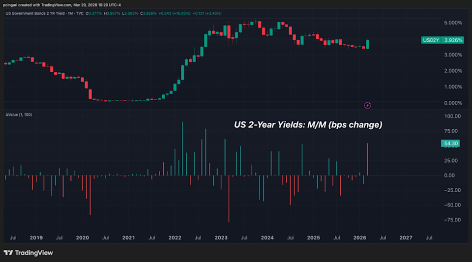 President Donald Trump has spent months aggressively pushing Federal Reserve Chairman Jerome Powell to cut interest rates. But 21 days into the war in Iran — with no end in sight — the bond market is starting to scream what Trump would never have expected to hear. A rate hike. Short-term interest-rate futures are now pricing chances of a Federal Reserve rate hike before the end of the year. Less than three weeks ago, markets had 60 basis points of cuts on the table. The Iran war has not just reversed that assumption — it has flipped it. Don't Miss: Investors With $1M+ Often Use Advisors for Tax Strategy — This Tool Matches You With One in Minutes Most Americans underestimate what they'll need to retire. Take a quick quiz to see if you're prepared. On Thursday, the yield on the 2-year Treasury note surged 12 basis points to 3.92%, marking its sharpest single-day increase since April 2025. The move caps a powerful repricing. On a monthly basis, 2-year yields have risen 54 basis points — the largest increase since February 2023, when the Fed was deep into its most aggressive tightening cycle in four decades. As a key proxy for near-term interest rate expectations, the 2-year yield is now signaling a shift in market pricing — with investors increasingly factoring in the risk of renewed rate hikes. When rate hikes become the base case, rate-sensitive equities — such as the Invesco QQQ Trust — tend to come under heavy pressure, much like they did during the 2022 tightening cycle. Trending: You Saved for Retirement — But Do You Know What You'll Keep After Taxes? Polymarket’s Fed rate hike market for 2026 has jumped to a 24% probability. Before the war started, the probability of rate hike was as low as 6%. The CME FedWatch tool now shows a 40% chance of at least one rate hike by October. And short-term rate futures have effectively priced out all remaining easing for the year. The speed of the repricing is as striking as the direction. At the start of March, the Federal Reserve was expected to deliver two to three rate cuts in 2026. That consensus has been dismantled in less than three weeks by a single variable: the price of crude oil. See Also: This Startup Thinks It Can Reinvent the Wheel — Literally Bank of America economist Aditya Bhave published a note Thursday laying out the three conditions the Federal Reserve would need to see before seriously putting rate hikes on the table. Labor Market Stability: In 2022, the Fed hiked through a technical recession because the unemployment rate was below 4% and falling. Modest payroll growth, steady jobless claims, and a stable job openings rate would support the case. Core Inflation Breakout above 3.2%: A 10% rise in WTI adds roughly 7 basis points to core inflation over time. If the Iran shock broadens into shipping, natural gas, fertilizers, and aluminum — a 2021–22 style supply disruption — 3.2% becomes reachable. Powell Still At The Helm: Fed nominee Kevin Warsh has not yet been confirmed. Bank of America views Powell as a moderate dove who would prioritize the labor market if risks are balanced — but far more hawkish than incoming nominee Warsh, whose recent comments have stressed urgency to cut. June is the earliest meeting at which hikes could begin, and only if Powell is still chairing. His conclusion: it would take a lot, but the conditions are not out of reach. The April 10 CPI report is now the most consequential data release in years. If it prints at 3.4% or above, the conversation shifts from whether the Fed can hike to when. Read Next: Instead of buying someone else's ETF, build an index around your own thesis with Public's AI tools. Get started and see if you qualify for the 1% match. Image: Shutterstock Up Next: Transform your trading with Benzinga Edge's one-of-a-kind market trade ideas and tools. Click now to access unique insights that can set you ahead in today's competitive market. This article Trump's Iran War Is Doing What No One Expected: Bringing Rate Hikes Back On The Table originally appeared on Benzinga.com