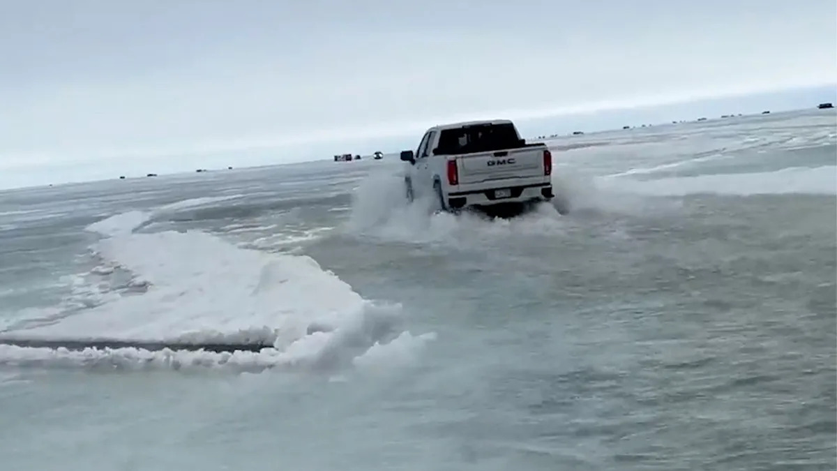 Viral video shows trucks driving through foot of water on thawing Minnesota lake