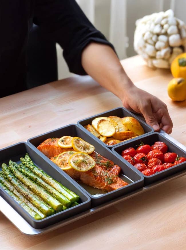 Promising reviews: "These make dinner so easy for a family of three. I just throw some fish in a long one and some vegetables in the other three and roast on 425 for 30 minutes. Super easy and convenient dinner. I have also done pork tenderloin and beef roast in these, all super easy and then if something needs more time than the other items you can remove the things that are done more easily. Overall really convenient and dishwasher safe." —Jasmine Schaffer