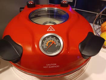 BuzzFeed Shopping contributor Jordan Grigsby has this and says, "I have this, so here are a few tips! Be careful and read the instructions! This thing gets suuuper hot (up to 800 degrees!) and you don't wanna pile ingredients up too high, or they'll burn on the little electric lamps. And be sure to continuously check on it! I've made frozen and homemade 'za with this, and I *personally* cook mine at 500 degrees because every time I've made pizza at 800, it burns on the outside and isn't cooked fully on the inside, or it's still frozen. It does take time to get the hang of it — I used this four times before I got it to cook a pizza perfectly, and OH MY GOSH. Best pizza ever, seriously. Pizza is my favorite food, especially brick oven style, and I've been determined to get this right, and I finally figured it out. I used Trader Joe's premade dough and sauce, threw my ingredients on, put it in at 500 degrees for about 5–7 minutes, and *voila* absolute perfection. I'm so excited I can have restaurant-quality pizza right from my kitchen and super fast, too! I can not wait to have a pizza party and impress everyone with my at-home brick oven-style pizzas. Yuuuuummmmm-y."