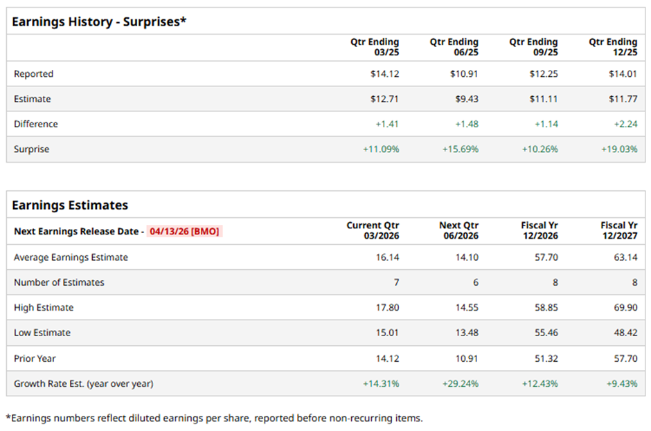 With a market cap of $246.5 billion, The Goldman Sachs Group, Inc. (GS) provides a wide range of services to corporations, governments, financial institutions, and individuals across major regions worldwide. The firm operates through Global Banking & Markets, Asset & Wealth Management, and Platform Solutions, offering services from investment banking and trading to asset management and digital banking. The New York-based company is slated to announce its fiscal Q1 2026 results before the market opens on Monday, Apr. 13. Ahead of this event, analysts forecast the company to report a profit of $16.14 per share, a 14.3% rise from $14.12 per share in the year-ago quarter. It has exceeded Wall Street's earnings expectations in the past four quarters. Investors are Piling into Microsoft Call Options - Unusual MSFT Options Activity Today Stocks Settle Lower as Iran War Boosts Crude Oil and Bond Yields Stocks Fall as Iran War Drags On Markets move fast. Keep up by reading our FREE midday Barchart Brief newsletter for exclusive charts, analysis, and headlines. For fiscal 2026, analysts expect the bank to report EPS of $57.70, a 12.4% increase from $51.32 in fiscal 2025. Shares of Goldman Sachs have soared 44.6% over the past 52 weeks, outperforming the broader S&P 500 Index's ($SPX) 13.7% gain and the State Street Financial Select Sector SPDR ETF’s (XLF) 1.7% decline over the same period. Shares of Goldman Sachs rose 4.6% on Jan. 15 after it reported strong Q4 2025 results, with EPS of $14.01 beating analyst expectations, driven by robust dealmaking and trading activity. Investment banking fees jumped 25% to $2.58 billion, while equity trading revenue hit a record $4.31 billion and fixed income, currencies, and commodities revenue rose 12.5% to $3.11 billion. The rally was further supported by optimism for 2026, as the management highlighted a strong outlook for M&A and capital markets amid improving regulatory conditions, lower interest rates, and rising corporate deal activity. Analysts' consensus view on GS stock remains cautiously optimistic, with a "Moderate Buy" rating overall. Out of 26 analysts covering the stock, eight recommend a "Strong Buy," one "Moderate Buy," and 17 give a "Hold" rating. The average analyst price target for Goldman Sachs is $968.95, suggesting a potential upside of 15.9% from current levels. On the date of publication, Sohini Mondal did not have (either directly or indirectly) positions in any of the securities mentioned in this article. All information and data in this article is solely for informational purposes. This article was originally published on Barchart.com