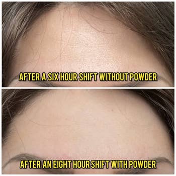 Promising review: "Let me start off by saying I have an oil problem...like it's not normal. I have EXTREMELY oily skin and hair. I can wash my hair and face and within 2 hours look like somebody just dunked olive oil on my head and my forehead is so shiny it's ridiculous. I purchased this and it has been a life saver. Seriously. If I apply this powder straight out of the shower to my forehead, my bangs will now stay looking fresh and grease-free until the night! I've even tried the overnight trick! And never once in my life have I been able to shower at night and wake up looking halfway normal. I wake up with minimal oiliness! It's wild! I will ALWAYS purchase this!" —Willow