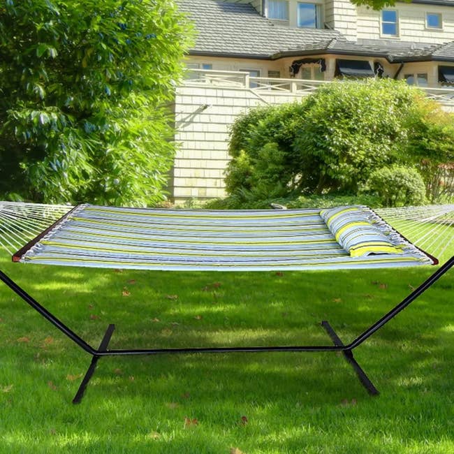 We hope you love our recommendations! While every product is independently chosen by our editors, BuzzFeed and our publishing partners may collect a share of sales or other compensation from the links on this page. You can read more about how our affiliate partnerships work in our Editorial Standards & Ethics Guide. Your outdoor space is about to be a springtime paradise thanks to these fab finds. Promising review: "I liked everything about this hammock: beauty, quality, easy assembly, and price. I roll out the hammock on the metal rack before each use so it's always clean and dust free." —SR Price: $69.99 (also available in blue and red) Promising review: "We were looking for a smaller Blackstone grill for our porch and this sure fit the bill. Very easy to assemble and been cooking on it since I also purchased the natural gas conversion kit, which makes it really simple and ready to use it any moment time." —Tom Promising review: "The pot is a great buy, especially for the price and having self-watering. It's good looking, the self-watering is super convenient, and my plant is happy! Going to buy more in other sizes!" —Meghan Price: $2.97+ (available in four sizes and two colors) Promising review: "These lights are AWESOME!! I love the pretty warm golden light they give off and they are each the size of a candle wax burner bulb, so they are big bulbs. Worth the small amount I paid and I am very pleased with this purchase!! =)" —Sebrina Promising review: "The item was readily available and easy to pick up. Setup was super simple as the chairs slide out complete. I chose this set for the price, functionality and fact that I can fold chairs up to keep out of sun while not in use and during hurricane prep. We look forward to using the set for as many years as we can." —LisaMayRey Promising review: "I like it! Works great. You have to put it together. The directions are pretty good and easy. It is pretty to look at as well. I like that it isn't too big so it can fit on my smaller porch." —Diane Price: $109.98+ (available in three styles) Promising review: "This is adorable. I can't get to most of my bird feeders in the winter due to disabilities. I love having all three types of seed in one feeder. I have it next to my patio doors for easy reach." —Linda Price: $24.99+ (originally $34.99+; available in four colors) Promising review: "I wanted something for my front porch to sit and enjoy the sun. This bench looks and sits comfortably on my front." —Sisandkay Promising review: "These seat cushions are larger and of great quality fabric. They are just the right amount of firmness, and soft and comfy at same time - great buy." —Bevster Promising review: "Great product to put on your deck/porch for the delivery guy to put delivery packages in so that the porch pirates don't get curious. It's sturdy enough for this purpose. If you are gonna cram it full of heavy items, you may want something stronger. It looks decent enough. You may want to put some weights in the bottom in case you have heavy winds. I actually ordered two of these." —NYdisowned Price: $15.99+ (available in three colors and eight sizes) Promising review: "Directions are pictures only and sometimes hard to follow. A few pieces were scuffed up, and a couple even bent but was easy to straighten. Most holes are pre drilled, but not all. Take your time it is worth it in the end. It came out sturdier than I thought it would, more support on the roof than expected. Looks nice!" —sterling Price: $159.99+ (originally $219.99+; available in three colors) Promising review: "Overall, I really enjoy having this trampoline The trampoline was shipped quickly. Directions were easy to follow. Trampoline is made very well. The mat is firm and bouncy. Great for families and came with an easy to follow instruction manual. The enclosure as well made and secure. Overall, highly recommend." —Aleeit Promising review: "It does the job of keeping the water from freezing and is just the right size. I also like the lip on in it you made, to be easy to pickup and change the water when its dirty is nice." —Rebecca Price: $29.99+ (originally $39.99+; avaialable in two sizes) Promising review: "I absolutely love it. TV who? 😂 The sound, the quality, the picture all of it is perfect. Highly recommend. About to buy all my family members one, plus it already had Netflix and YouTube so all you really need is Wi-Fi/Hotspot and you good." —Rosa Price: $38.99+ (originally $49.99+; available in two colors and styles) Promising review: "This is a great sofa at a nice price. Very comfortable for my whole family. Looks like high quality and sturdy. Very happy with this purchase!" —Raquel Promising review: "Helped cut down the sun, easily bring the temperature down at least 20 degrees for the area. I don't know why people complained about the rain, it is not 'waterproof,' however it's pretty thick so it requires the sail to be hung in a way that it can shed water quickly instead of letting water pool in the middle and wait for the water to drain away. No matter which shade sail manufacturer you purchase from, they all require the same attention when you hang it." —Ryan Price: $71.99+ (originally $119; available in two sizes and two colors) Price: $18.11+ (available in four styles) Promising review: "Love this tub! Super fast easy set up. Gets hot and stays hot. The cover is well insulted. You can use the bubble feature or heat feature not both at the same time. However, it stays hot for a while and bubbles shut off automatically after 20 mins anyway. I leave the cover partially on and I don't lose much heat even with bubbles on and heat off. Love it." —AngelA Price: $349.99+ (available in two styles and three colors) Promising review: "Used this to keep my pasture green this past August for my grandson's wedding and it worked great. Kept one acre looking lovely in over 100 degree heat and that was good enough for us." —Pamela Promisin