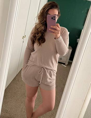 Promising review: "This pajama set is really comfortable and soft. The waffle-knit fabric feels cozy without being too heavy, and it’s comfortable enough to wear for lounging or sleeping. The fit is relaxed and easy, and it doesn’t feel tight or restrictive. I also like that it keeps me warm without overheating, which makes it great for cooler nights. Overall, it’s a cute, comfy set." —M. Vause