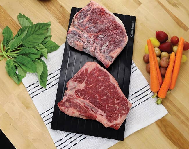 Promising reviews: "My family freezes everything, and I’m terrible at planning dinners ahead of time. This tray has been a game-changer. It defrosts food much faster than leaving it on the counter. It works best when the meat is removed from the packaging and placed directly on the tray. We use it a couple of times a week, especially on busy nights. Simple, effective, and really does what it promises. Don’t miss out, buy it!" —Amazon Customer