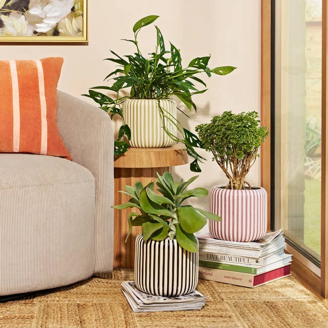 Promising review: "This flower pot arrived in good order, no chips, etc., which I do appreciate a lot. I am very particular that the flower pots are in excellent condition upon arrival. It is so classy, and I love that you can take the plug out and use the drainage hole, or leave it in to prevent water from seeping onto whatever. The pink is not too flashy, but it is definitely noticeable. I have placed my plant that has pinks in the pot, so it really complements the pot greatly. I can only imagine that the one in black stripes is even more dramatic. May have to order that next. Highly recommend, and I love it." —Carolyn